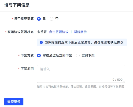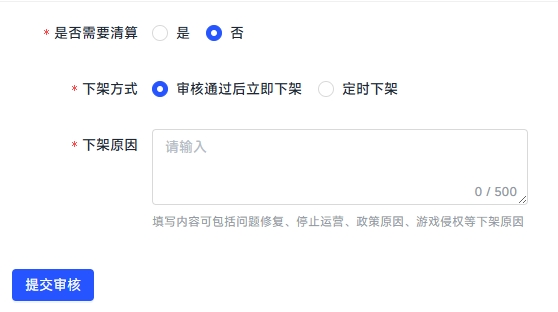 - 需要清算:是指该游戏停止运营和维护的永久性下架。如果需要清算最后的流水,请按照下方“下架清算”流程进行操作。
