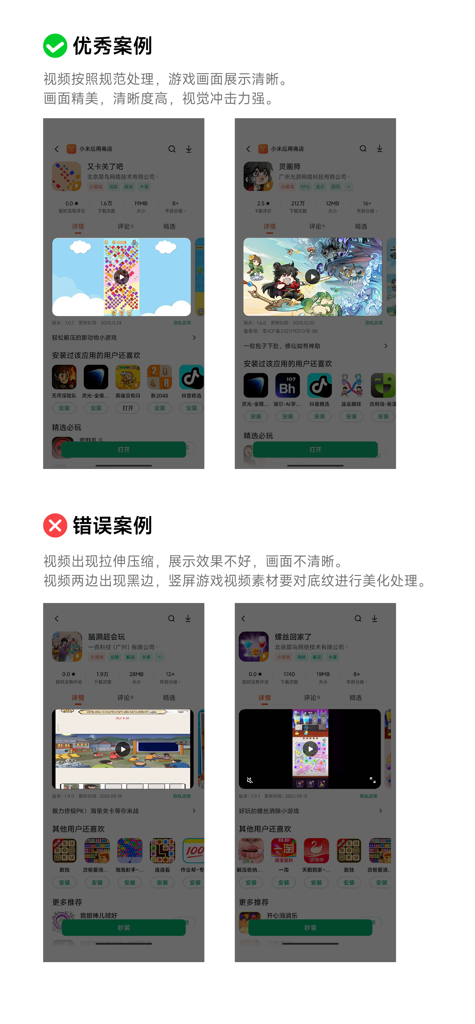 - 视频素材禁止出现拉伸、压缩 或竖屏带黑边,竖屏游戏视频素材要对底纹进行美化处理