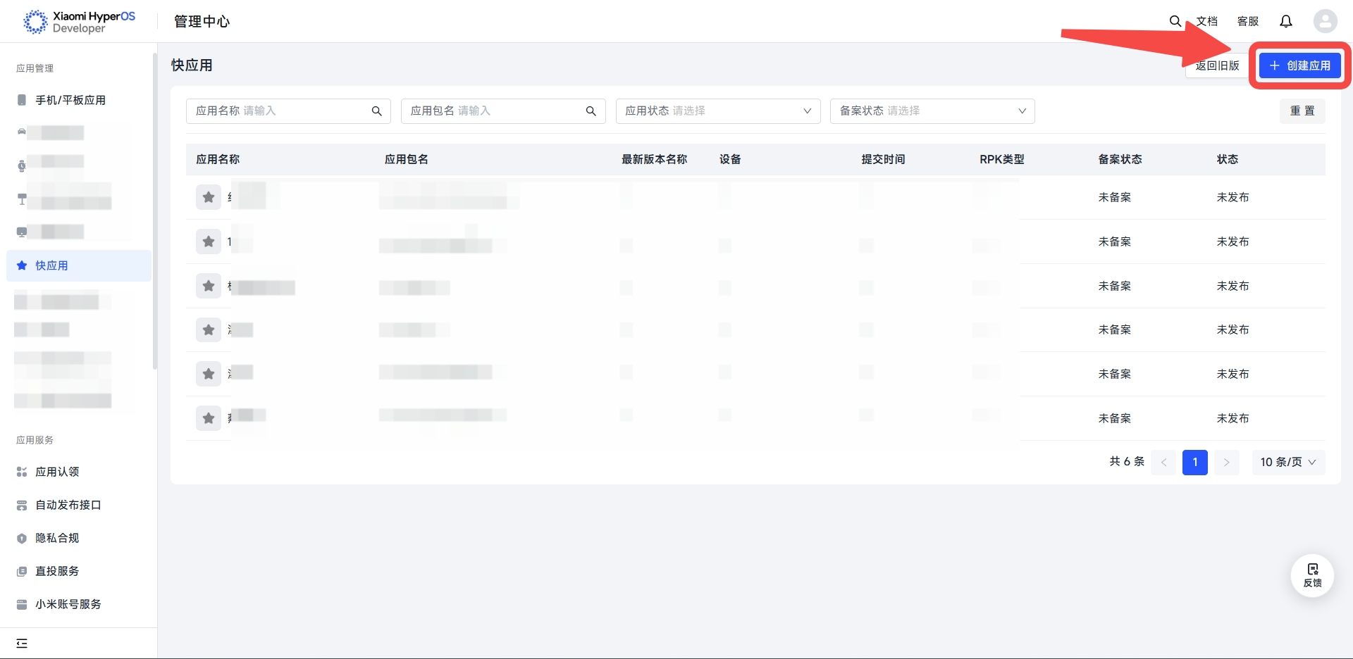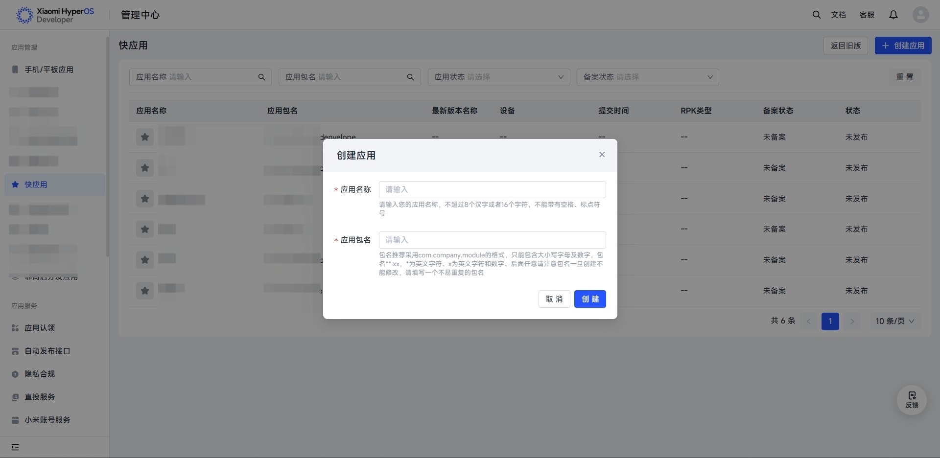 ① 登录并前往小米澎湃OS开发者平台,在快应用页面中,点击“创建应用”按钮,即可开始快应用首次创建。