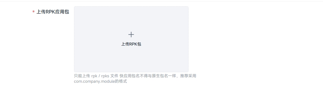 5、根据RPK打包规范打包上传,文件小于2M;应用名称与应用包名不可编辑,需要填写对应的原生应用包名,如果有多个请填写多个包名,最多不超过5个;