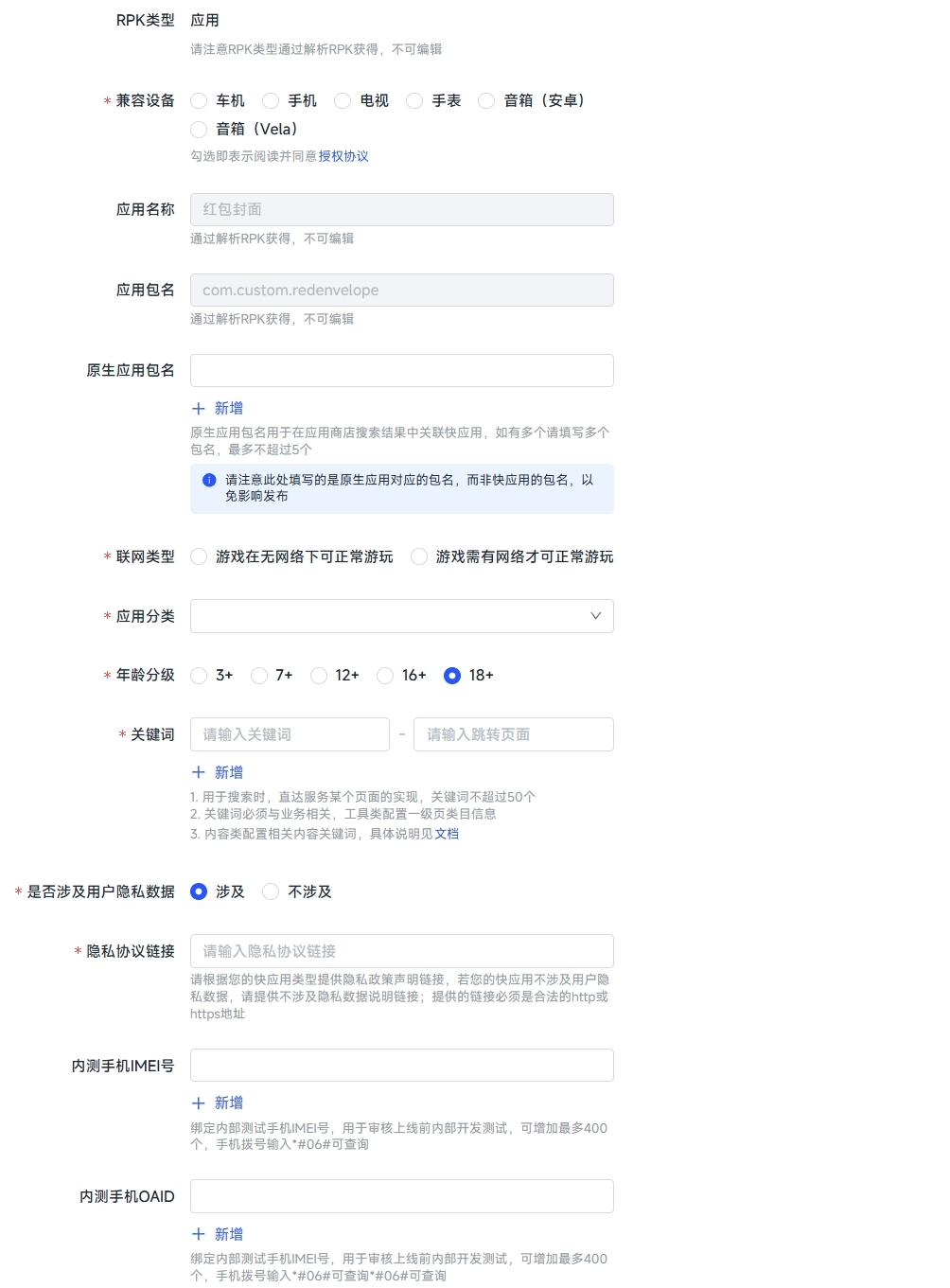 您需要针对您的应用准备rpk/rpks的安装包用于上传,我们将自动为您解析安装包内声明的信息,请您务必仔细核对。