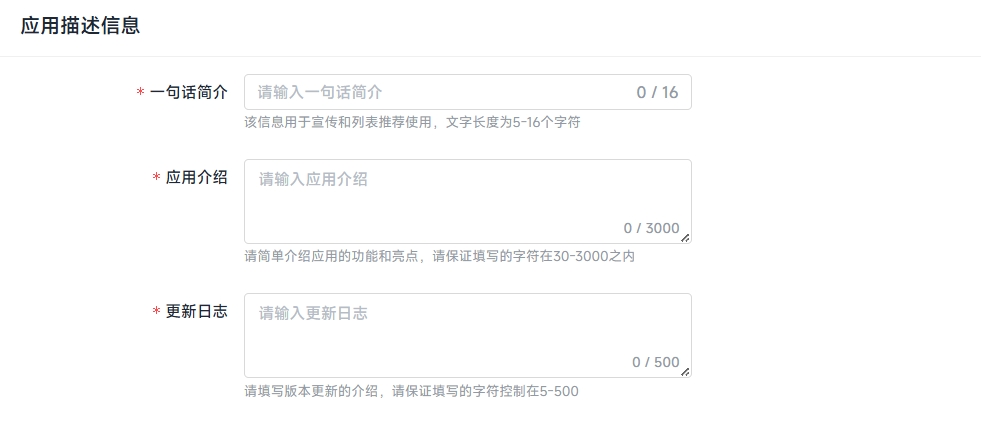 在应用描述信息模块中,您可以配置应用发布对外展示的信息,包括一句话简介、应用介绍、更新日志,具体如下: