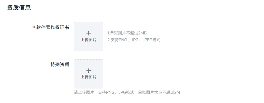 在资质信息模块中,您需上传应用的软著、特殊资质信息,具体如下: