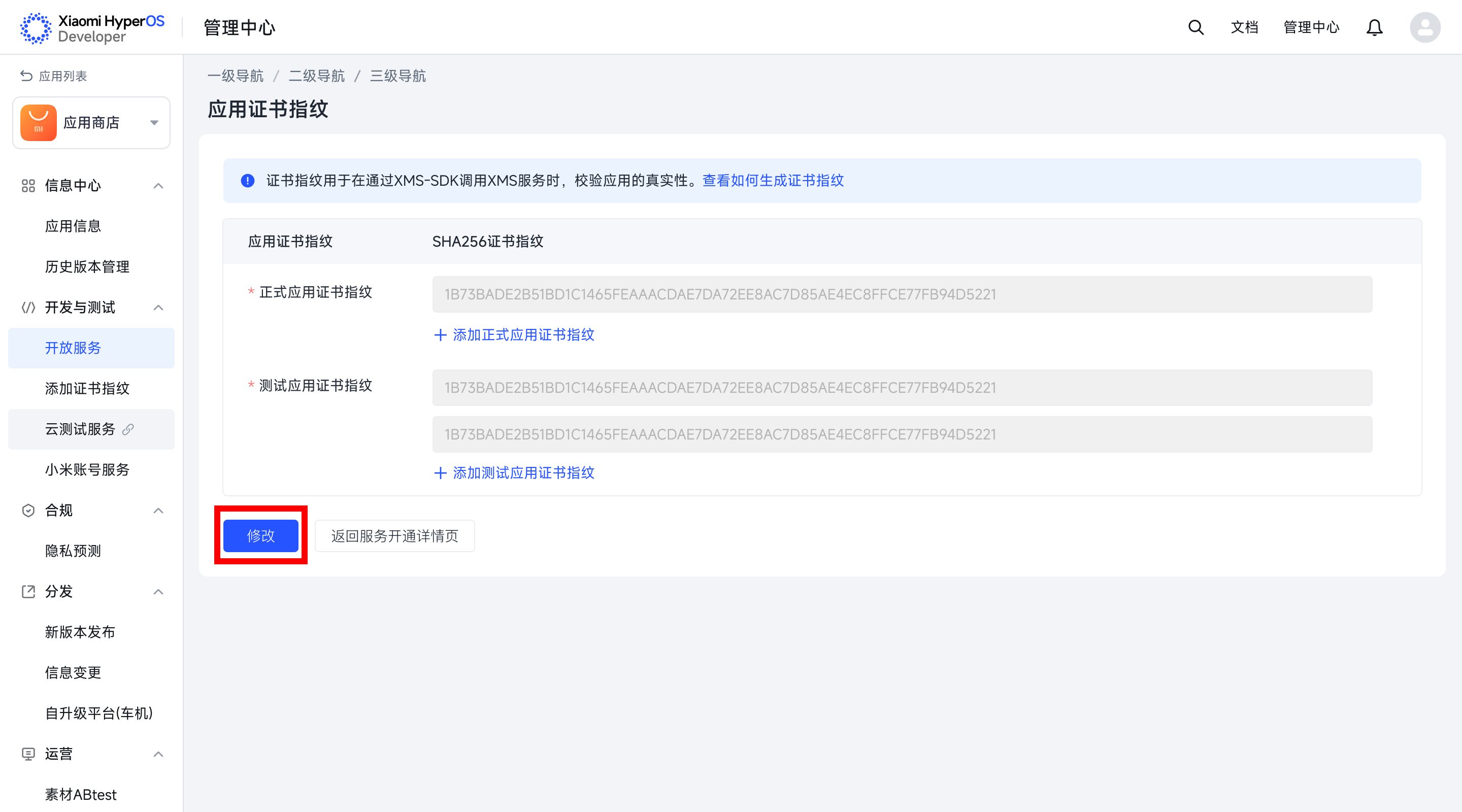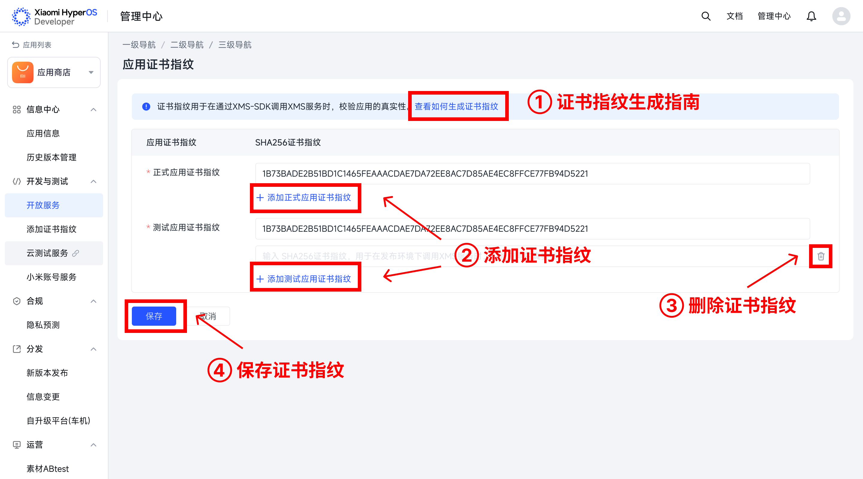 注:测试应用证书指纹至少配置一个,最多配置5个,正式应用证书指纹至少配置一个,最多配置5个