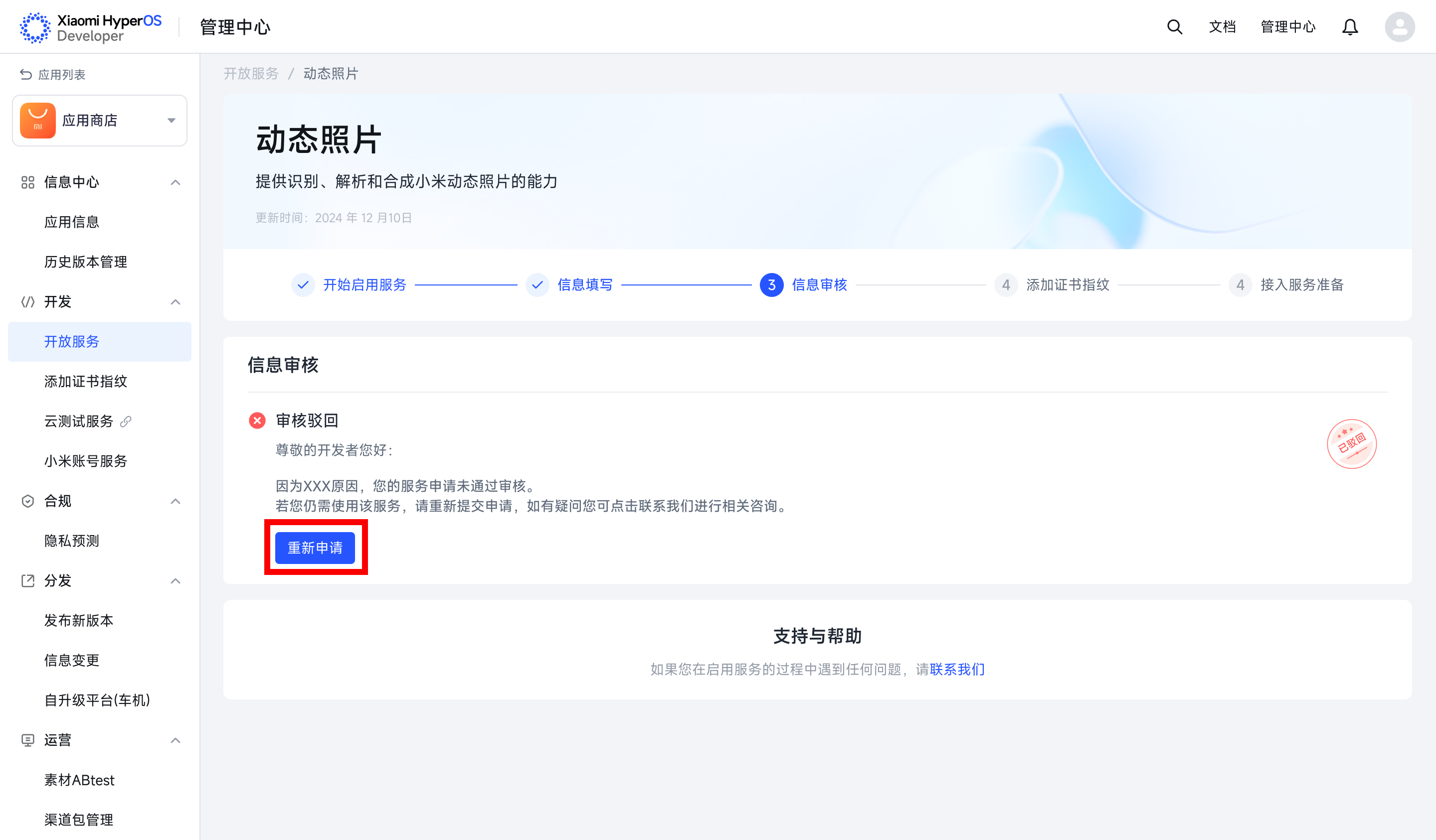 - 审核未通过,开发者需根据驳回理由进行修改,修改后,点击【重新申请】,进行二次申请;