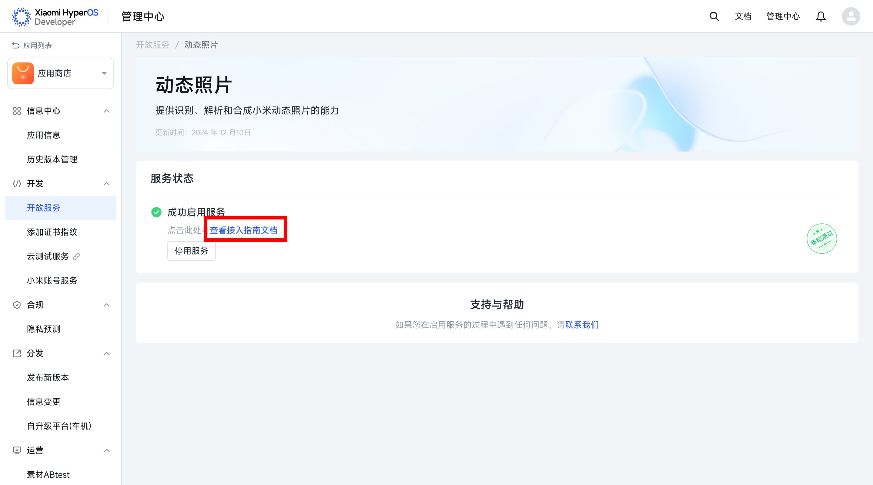 - 成功启用服务后,点击【查看接入指南文档】,查看具体服务的接入指南