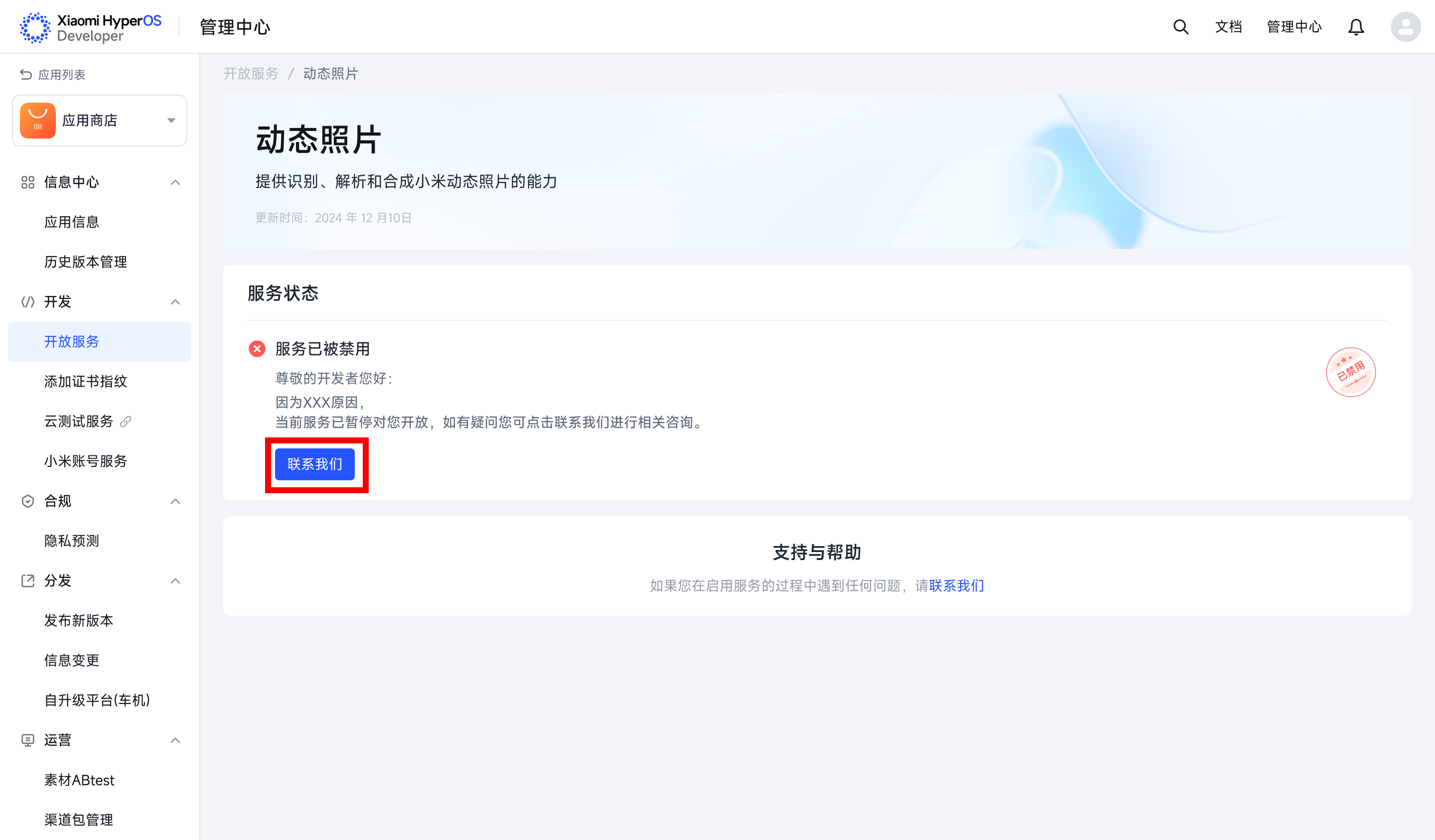 - 查看禁用原因,若对服务禁用原因存疑,可点击【联系我们】,与平台客服联系