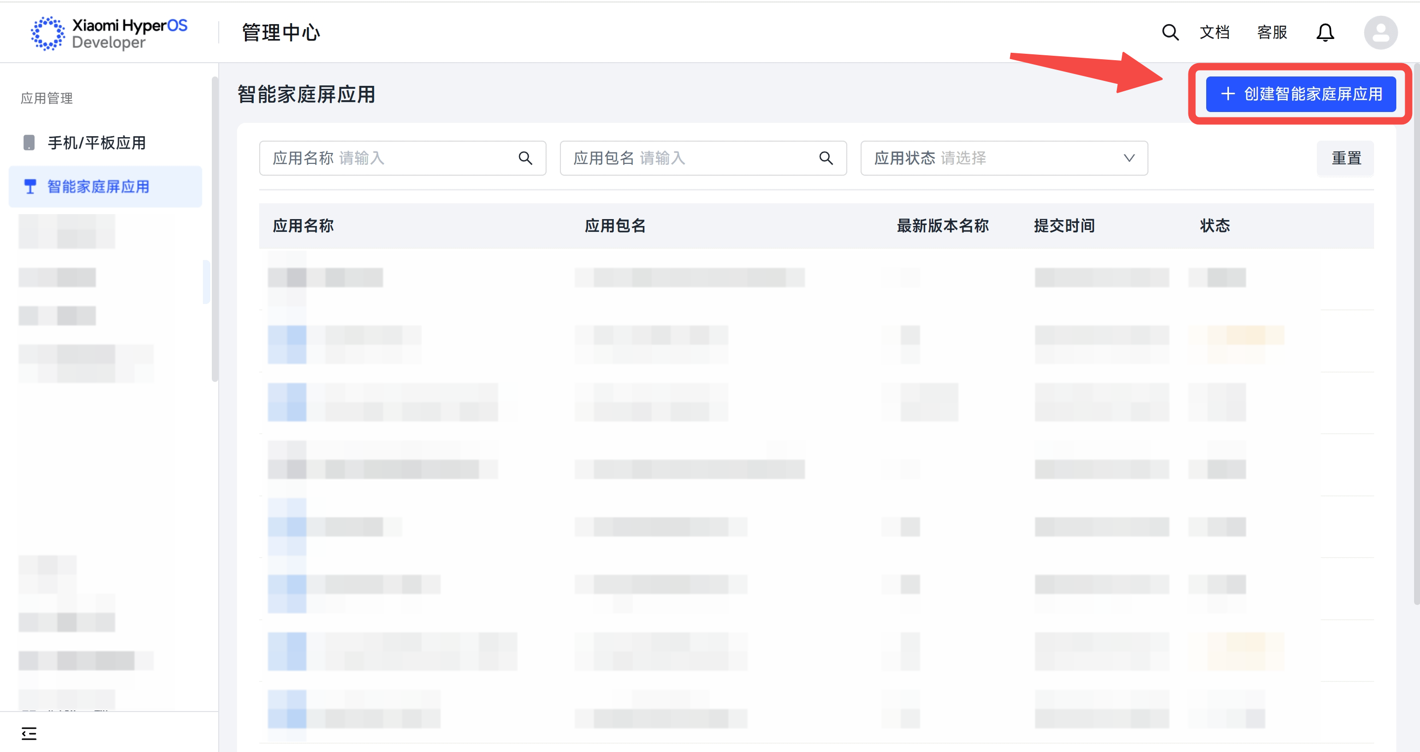 ① 登录并前往小米澎湃OS开发者平台,在智能家庭屏应用页面中,点击“创建智能家庭屏应用”按钮,即可开始应用首次创建。