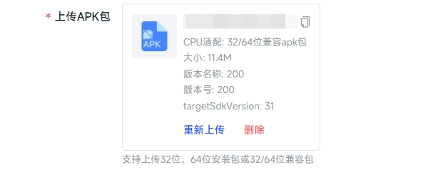 | CPU适配 | 针对包体内声明的ARM架构内容判断 | 需上传32位、64位包体或32/64兼容包 |