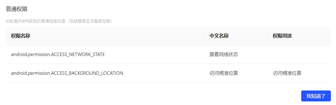 权限信息将会在APK上传完成后进行解析,此处仅供开发者进行核对;