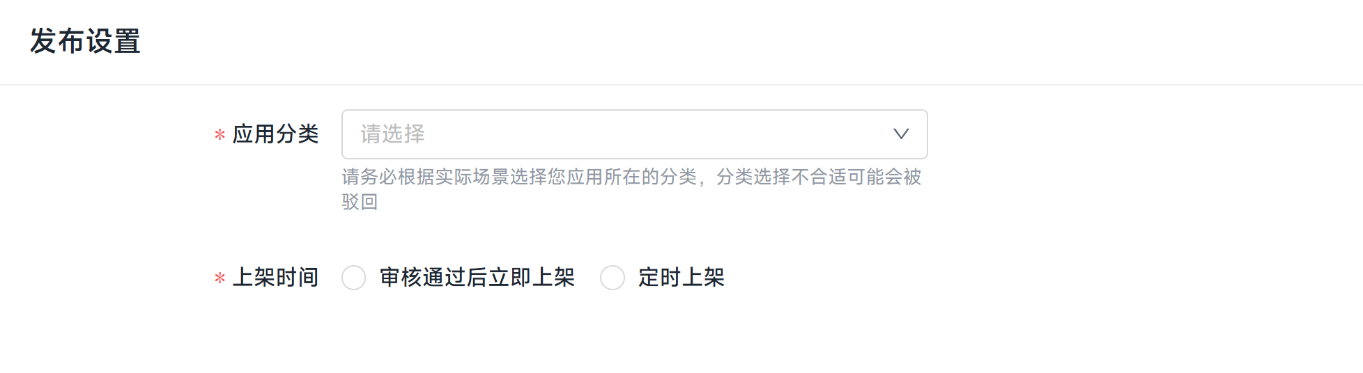 在发布设置模块,您可以配置应用发布的内容,包含应用分类、上架时间,具体如下: