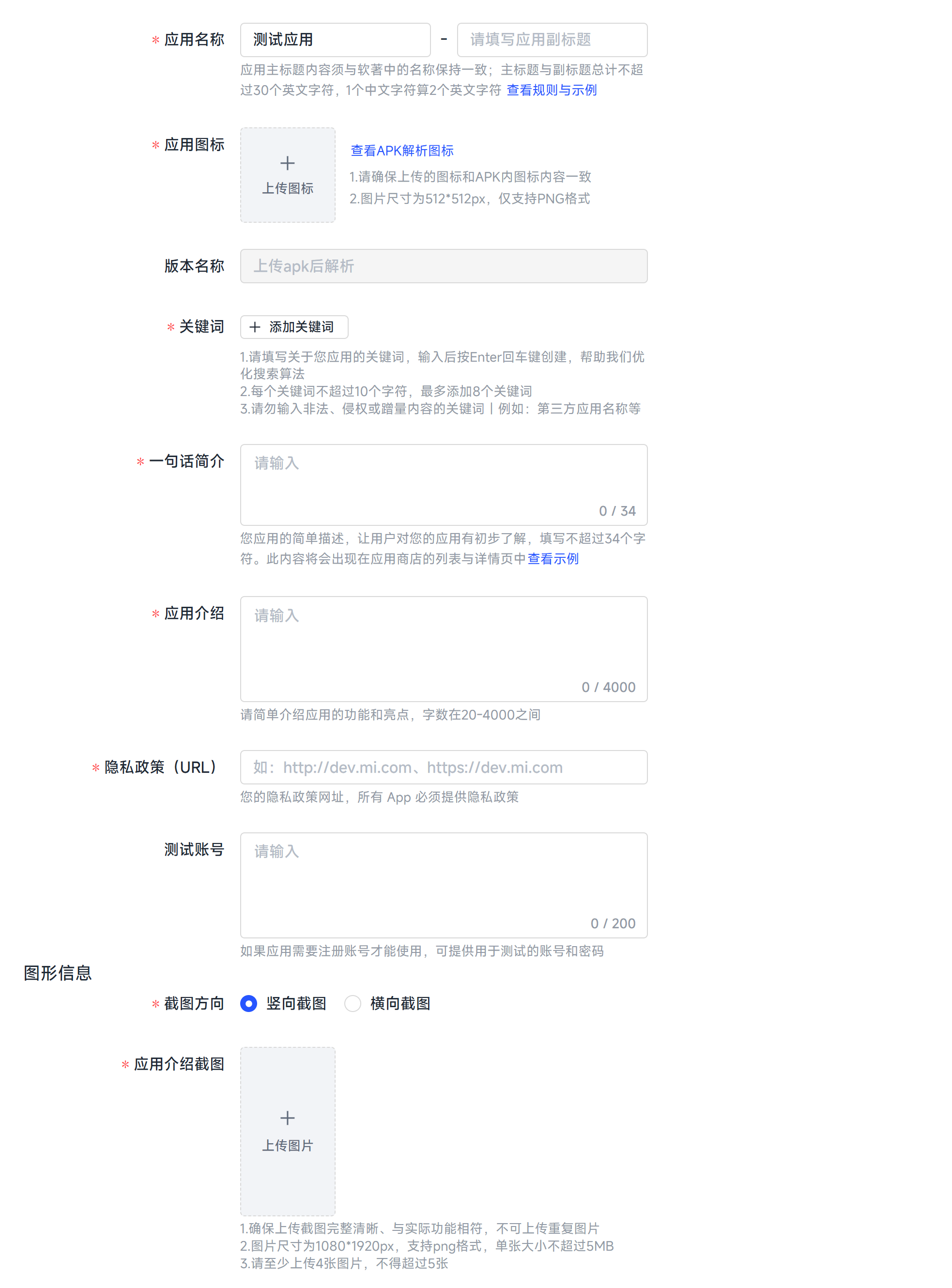 在展示信息模块中,您可以配置应用在商店内展示的基础信息与截图等媒体信息,其中带星号标注为必填项。