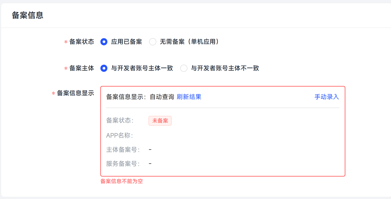 我们会自动查询您的应用备案信息并展示,请您确认相关备案信息,其中带星号标注为必填项。