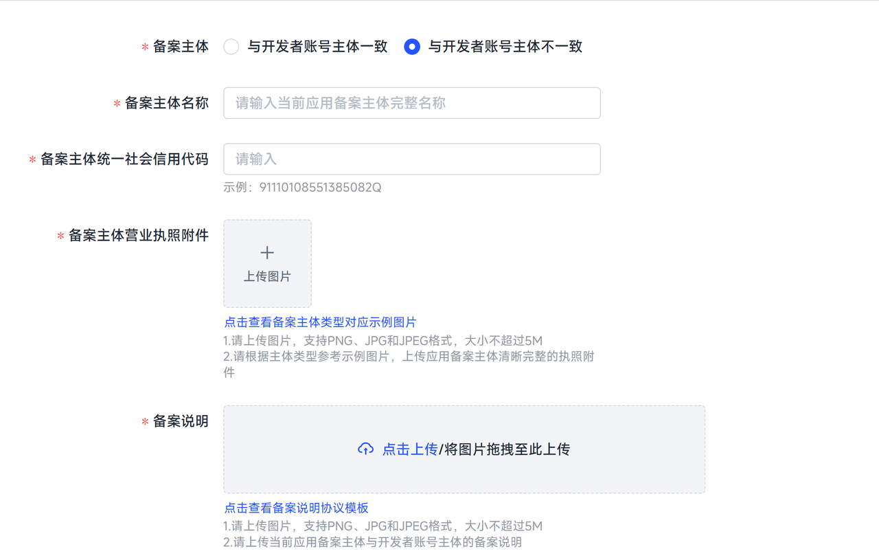 若您的应用备案主体与开发者账号主体不一致,则需填写备备案主体名称、统一社会信用代码、营业执照附件及备案说明。