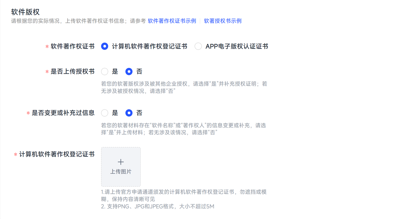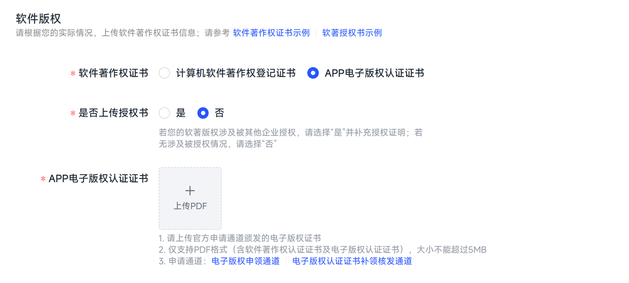 您需上传软件著作权证书信息,我们支持”计算机软件著作权登记证书“或”APP电子版权认证证书“两种类型,您选择其一上传即可。