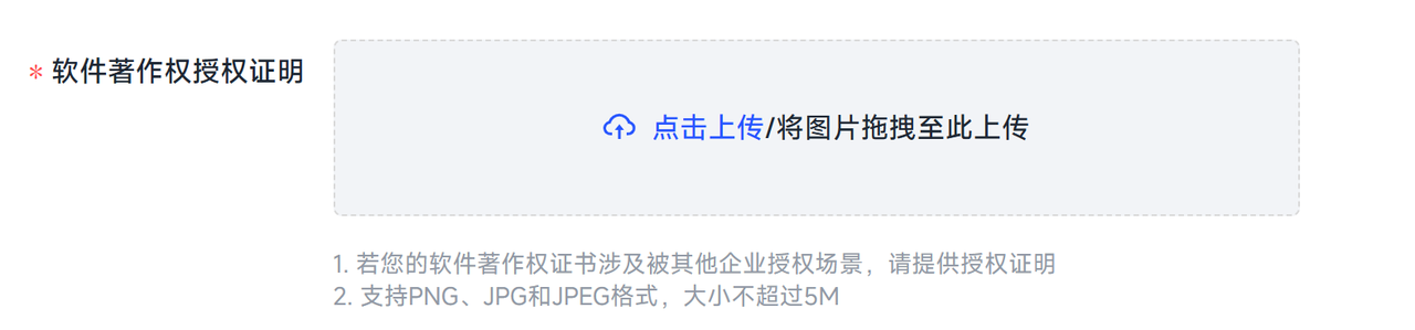 ① 若您选择软件著作权证书,则需上传对应的计算机软件著作权登记证书;若您选择APP电子版权认证证书,则需上传对应的APP电子版权认证证书。