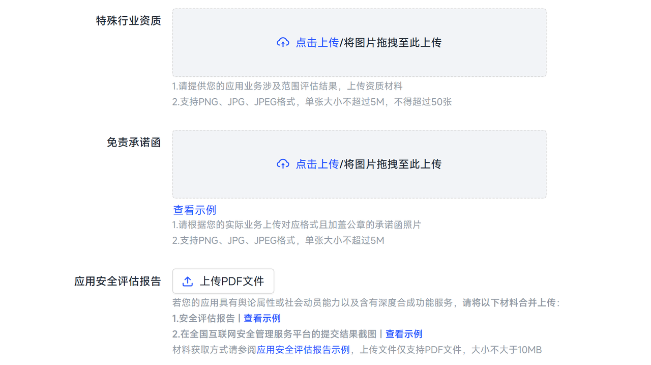 ② 根据特殊行业资质的要求,上传特殊行业资质、免责承诺函、应用安全评估报告。