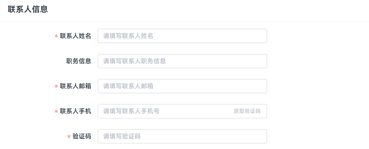 | 手机 | 必填 | 请填写联系人的手机号,在应用遇到相关问题时,我们会优先使用此号码联系到您 |