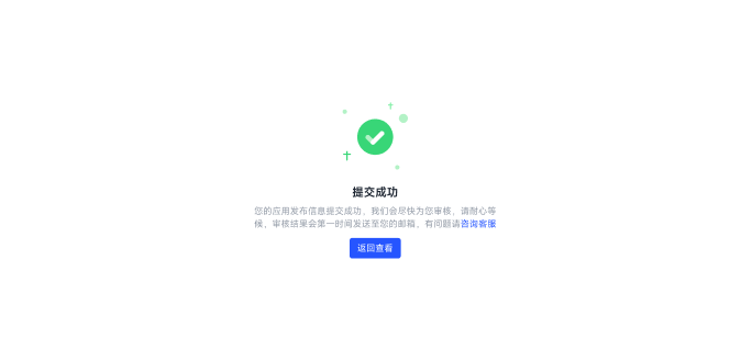 所有信息填写完成并确认无误后,您可点击底部”提交审核“按钮,此应用的版本将会进入审核流程,我们将会在1~3个工作日内完成审核