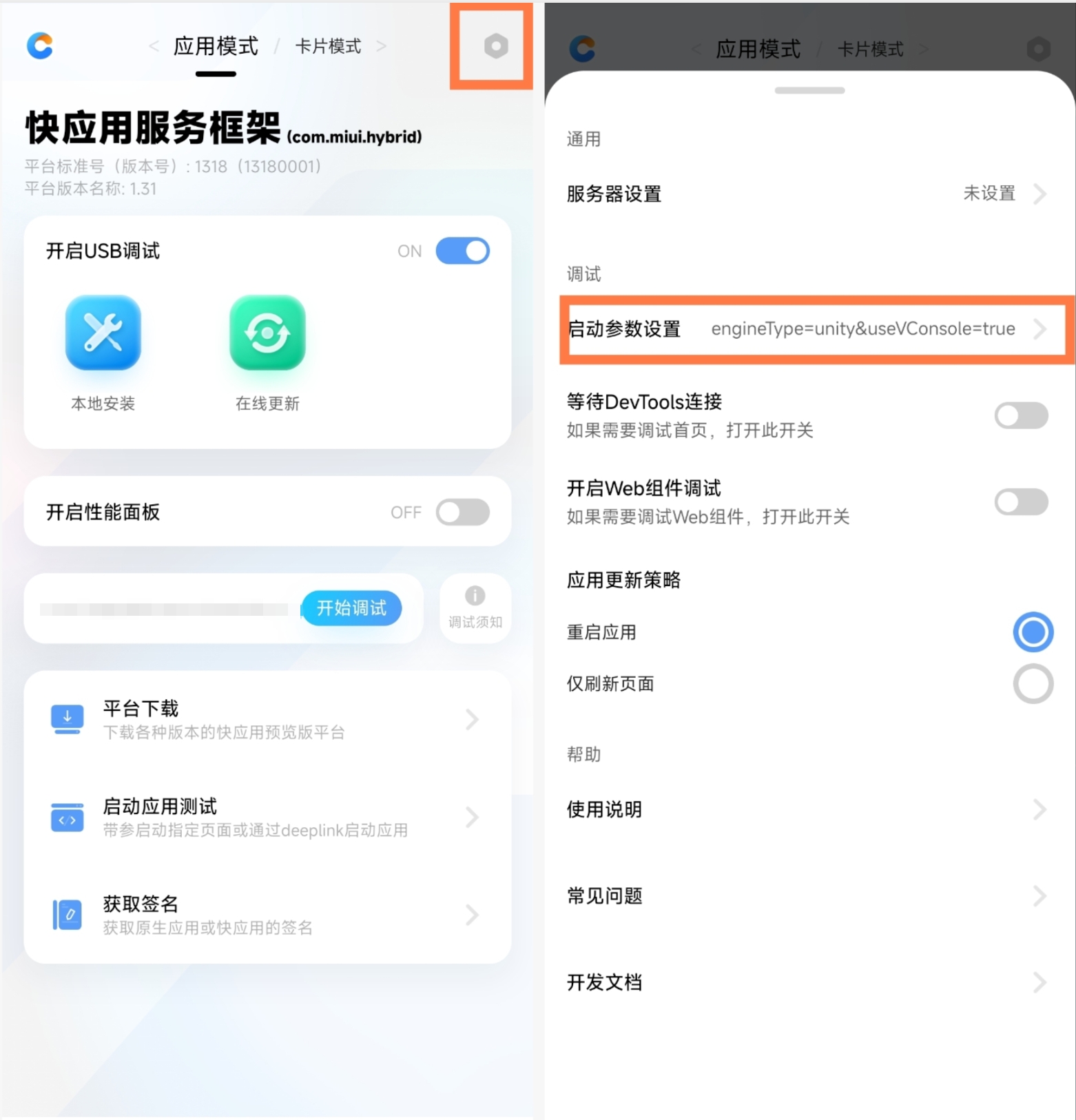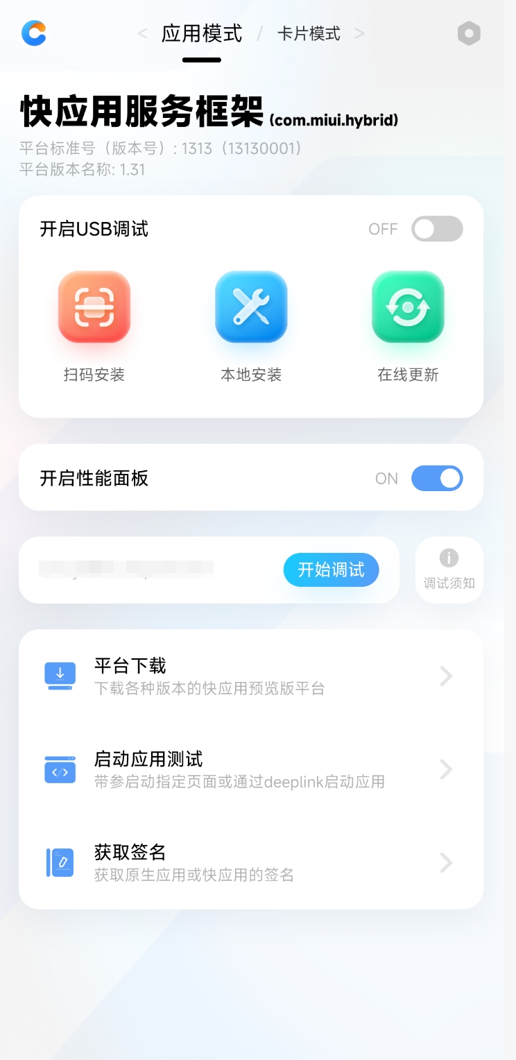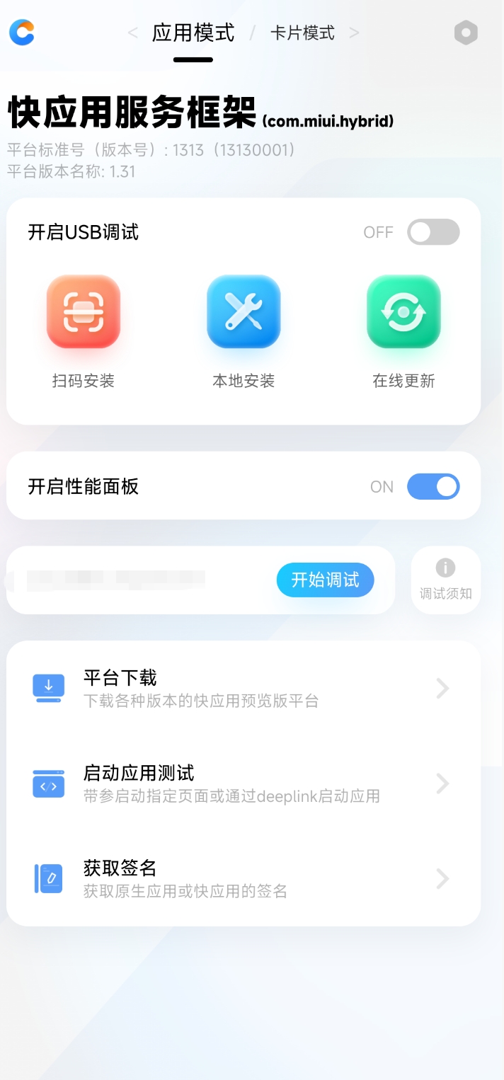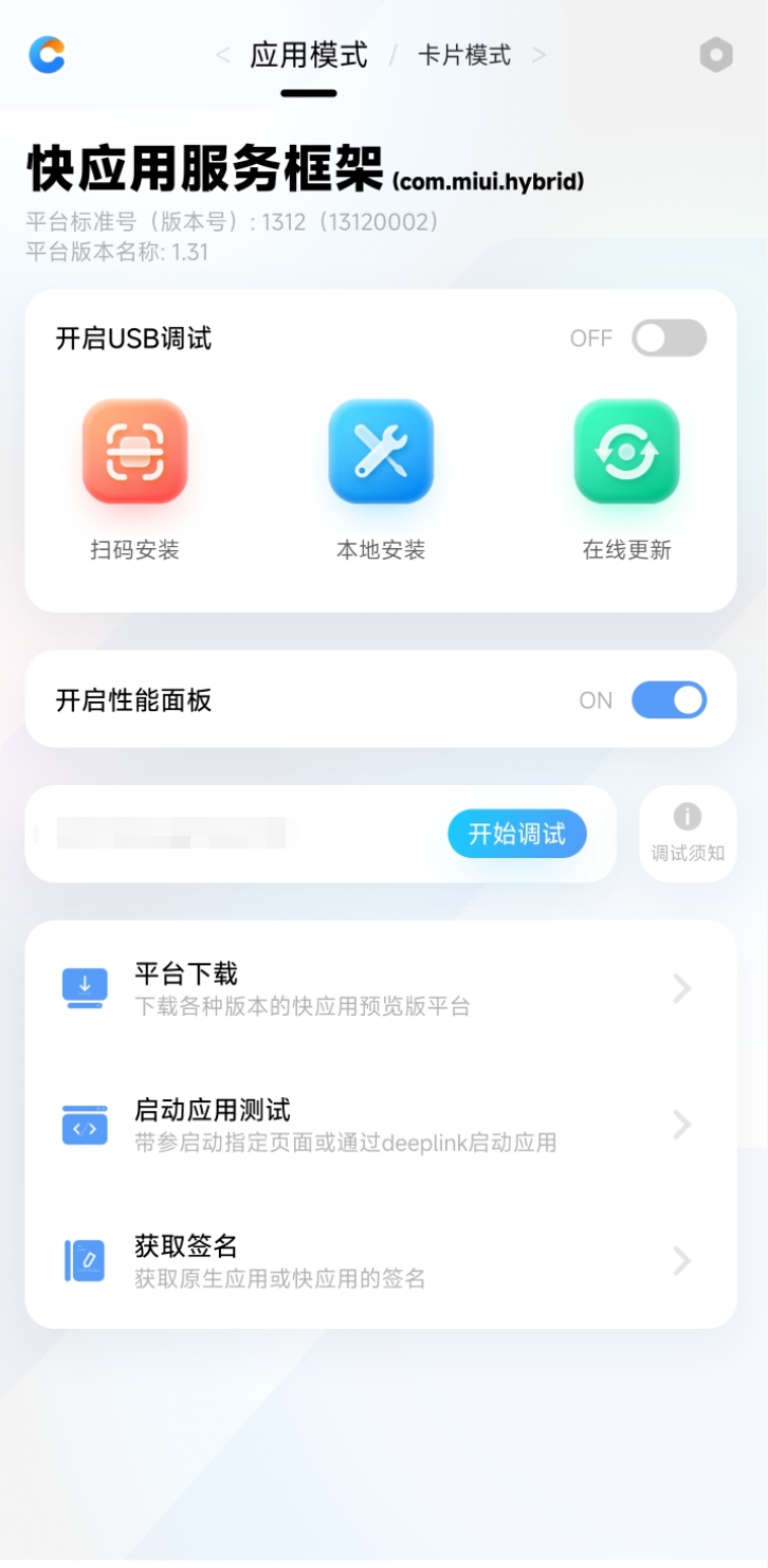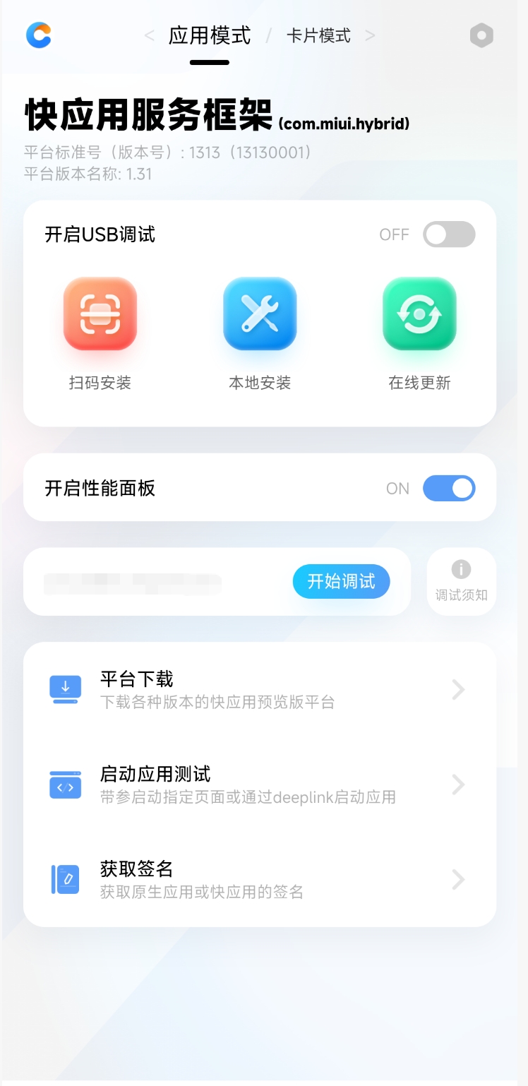 安卓手机安装快应用调试器,打开安装后的快应用调试器(以下简称“调试器”),确认平台为com.miui.hybrid