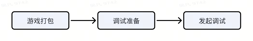 完成小游戏开发之后,就可以进入调试阶段了,整个调试流程分为打包阶段、调试准备阶段以及发起调试阶段: