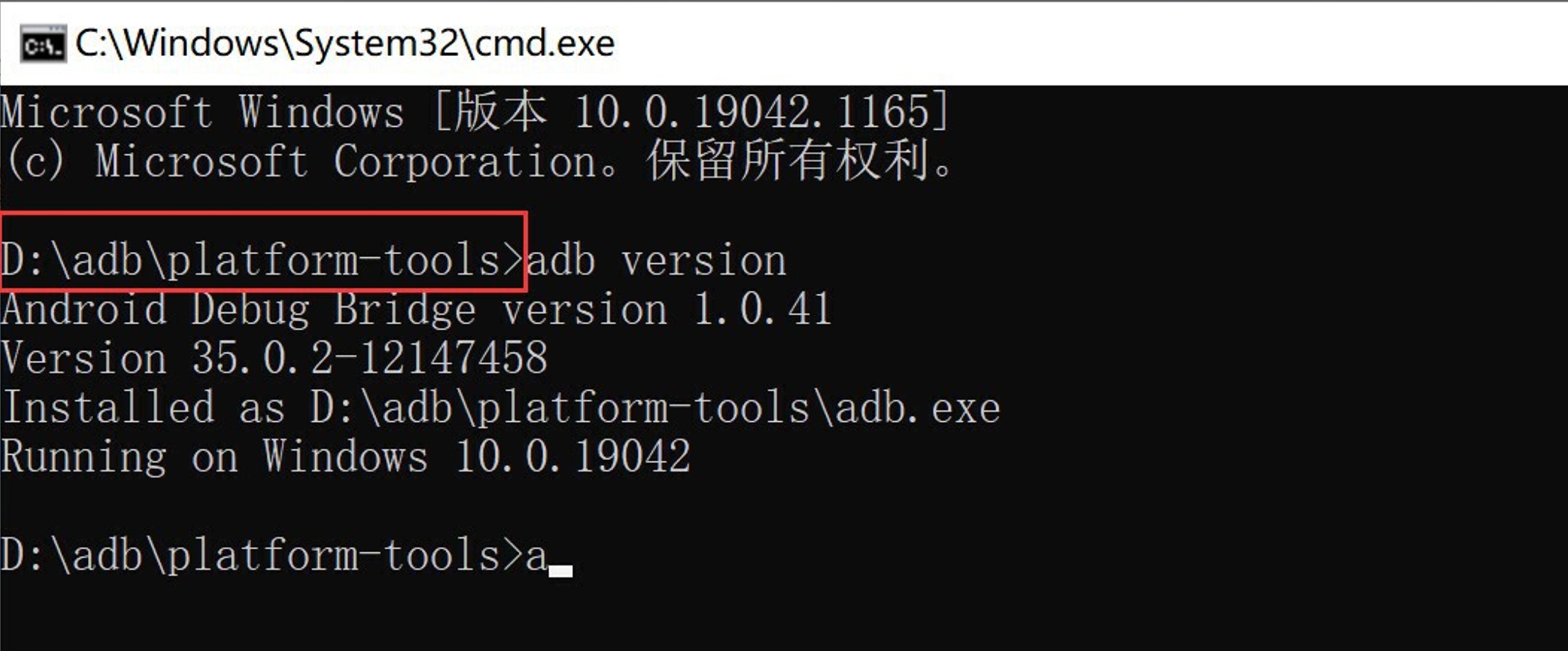 下载完成后对下载文件进行解压,并在解压目录内调起命令行工具,执行adb version,可以查看是否可用。