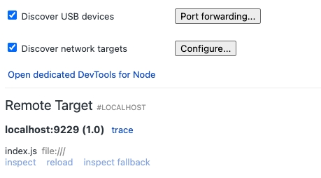 adb forward tcp:9229 tcp:9229打开Chrome浏览器并在地址栏输入chrome://inspect(如果使用的是Microsoft Edge浏览器,地址可改为edge://inspect),勾选Discover network targets选项。