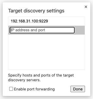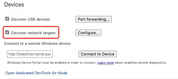 打开Chrome浏览器并在地址栏输入chrome://inspect(如果你使用的是Microsoft Edge浏览器,地址可改为edge://inspect),勾选Discover network targets选项。