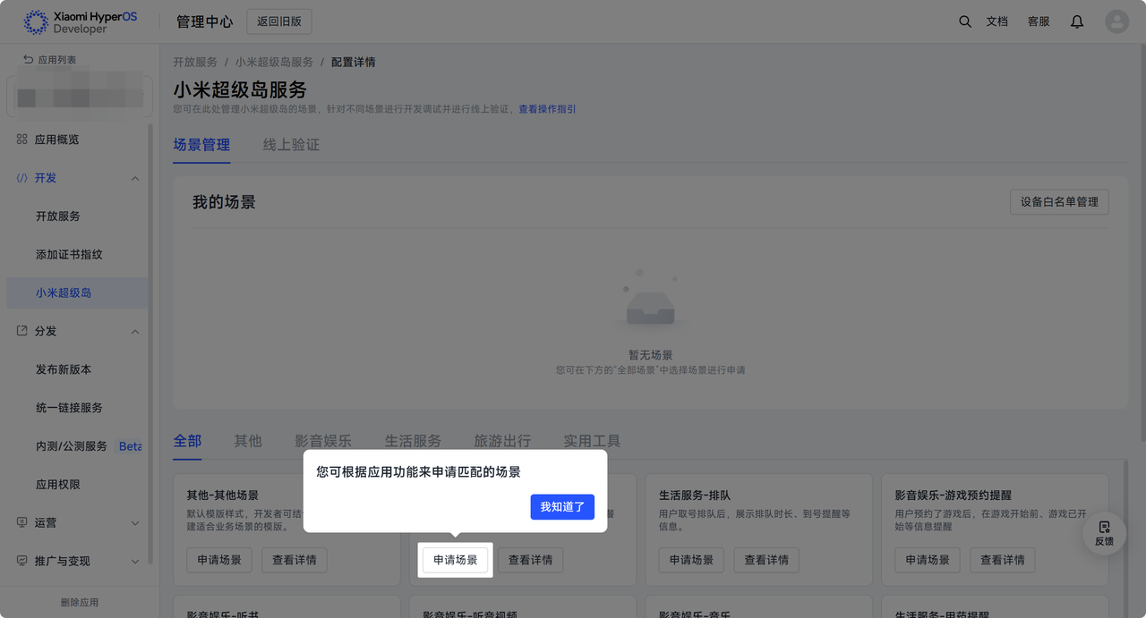 - 首次进入需要在下方场景列表中选择场景并申请,如果没有找到对应场景,请选择(其他)场景。