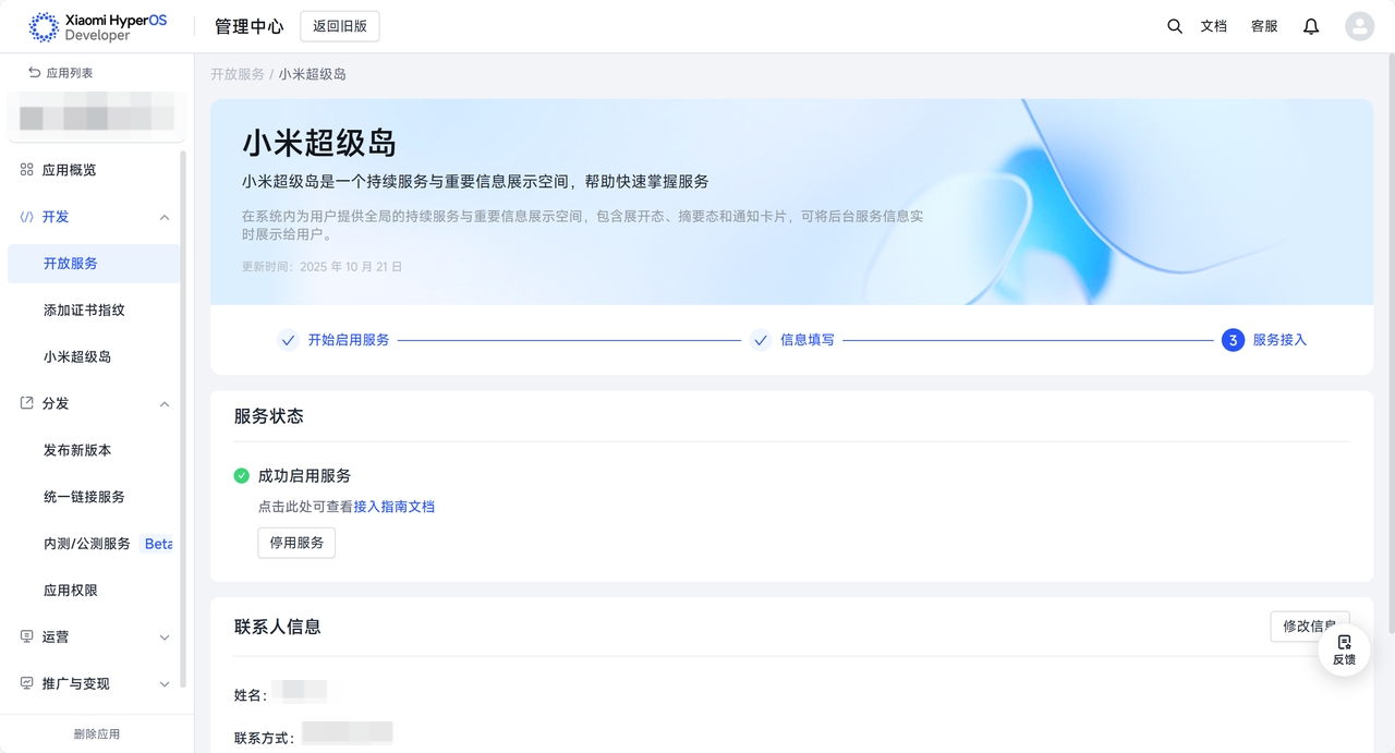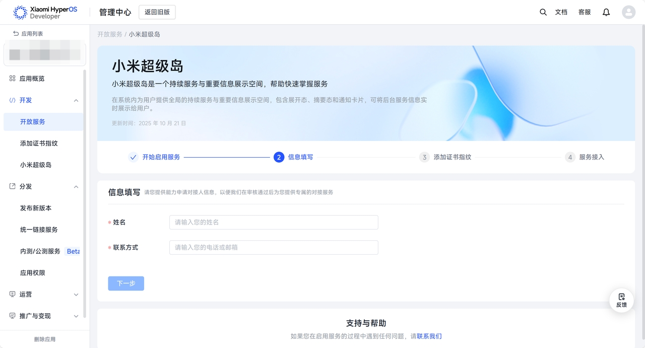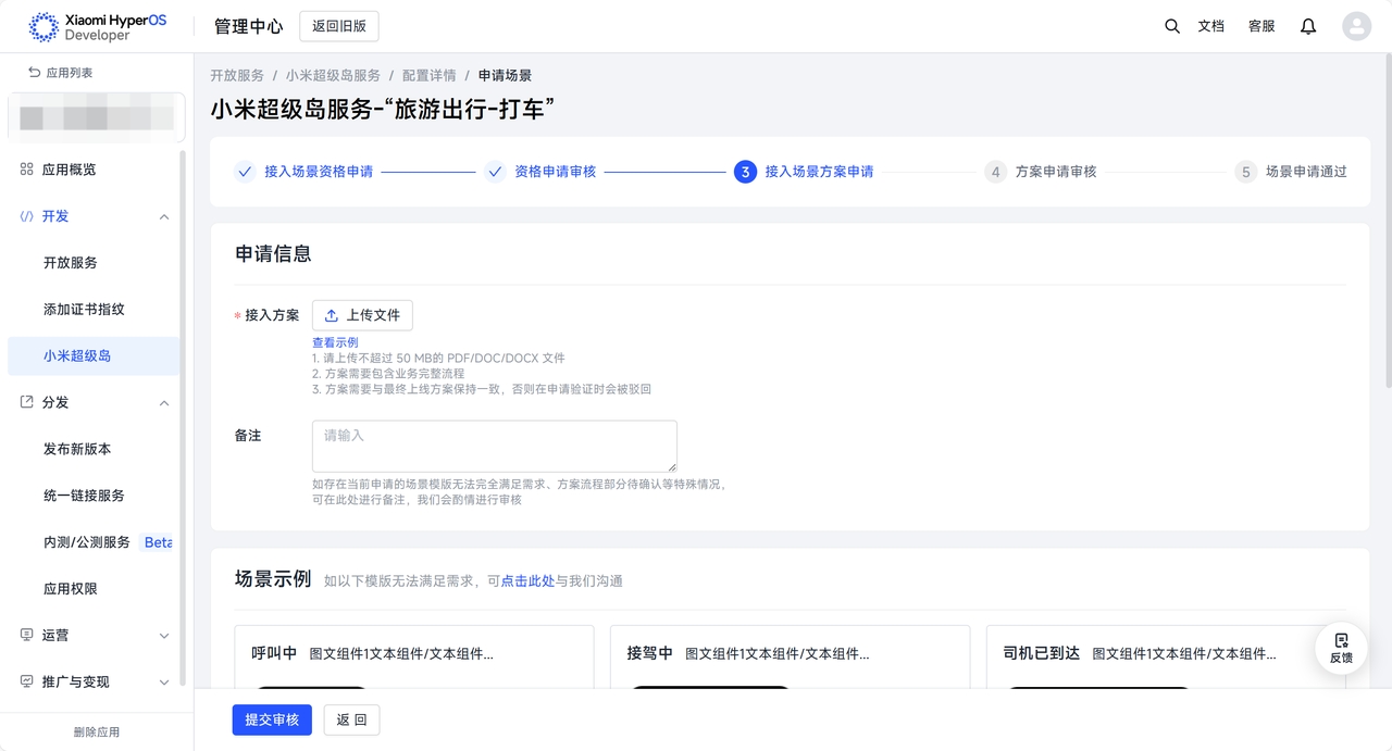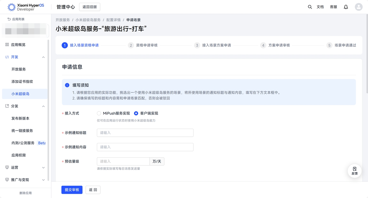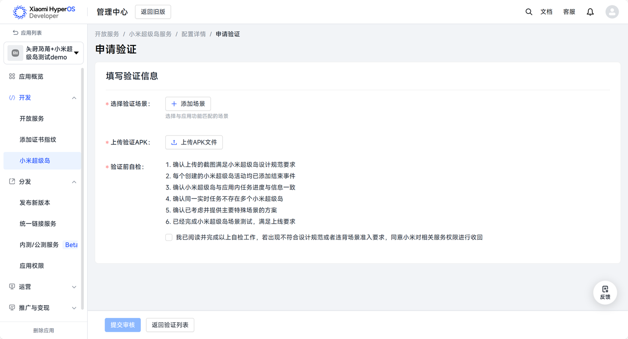 - 填写申请信息,并完成提交。验证通过后应用会获取小米超级岛正式权限,即可发版上线。