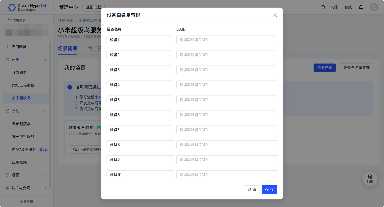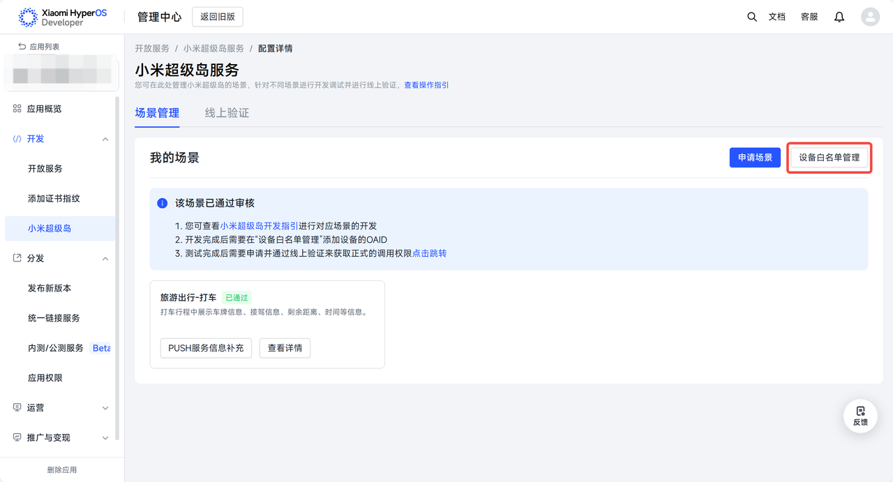 设备白名单管理能力可用于应用小米超级岛场景上线前的验证,体验应用即将上线的小米超级岛场景。