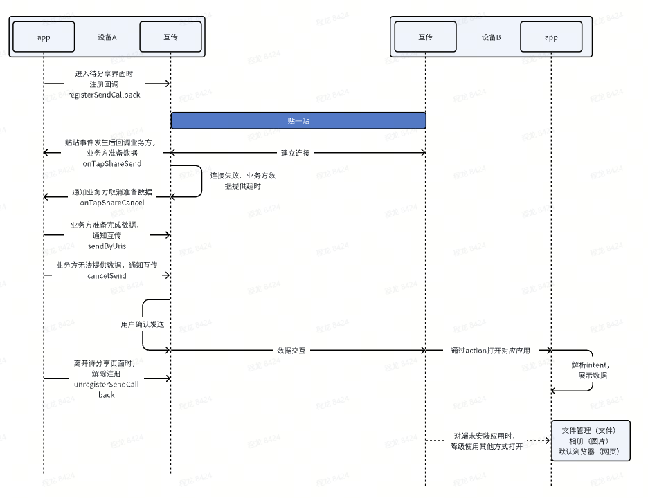 | unregisterSendCallback | 1. 解除注册接口,业务方通知互传无需触发后续贴贴流程 2. 在主线程中调用 3. 调用时机:在离开分享页调用 | 1. Activity 2. TapShareSendCallback 贴贴事件发生后的回调 | 1. int: a. 0为成功 b. 非0为本次调用错误 |