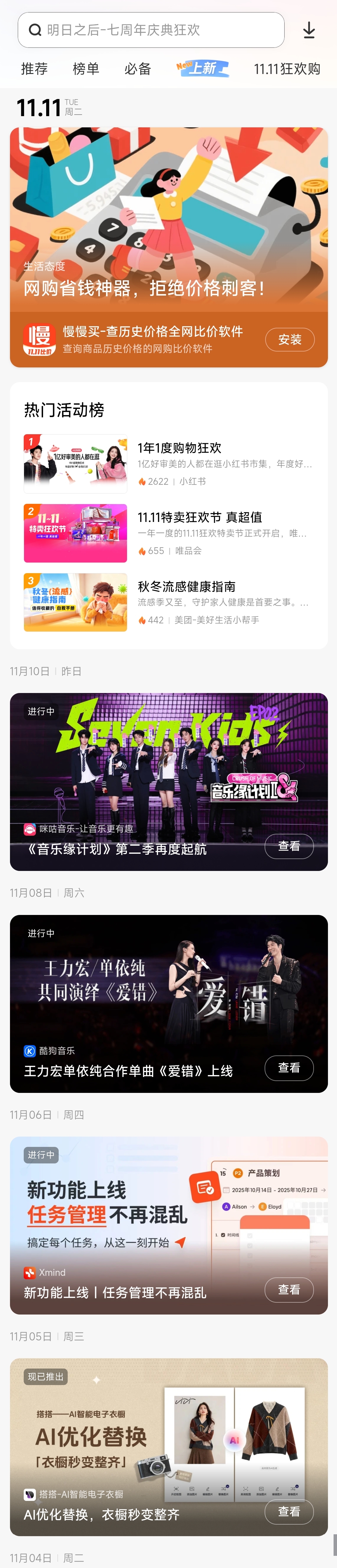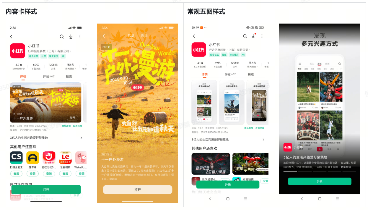 为提升用户在应用下载决策过程中的信息获取效率,小米应用商店推出应用详情页「活动卡片」功能,该卡片位于小米应用商店-应用详情页五图卡片前,可用于展示应用内的运营活动、热点内容、剧集上新、功能更新等,支持多个活动同时展示(同时最多5个活动),优质活动会额外被推荐至商店首页【上新页】进行推荐,为用户提供更加直观&丰富的内容体验,相较于应用详情页五图卡片,活动卡片更具备新鲜感、参与性和视觉集中性,能够有效推动用户做出应用下载、应用激活决策,助力应用分发效率提升。