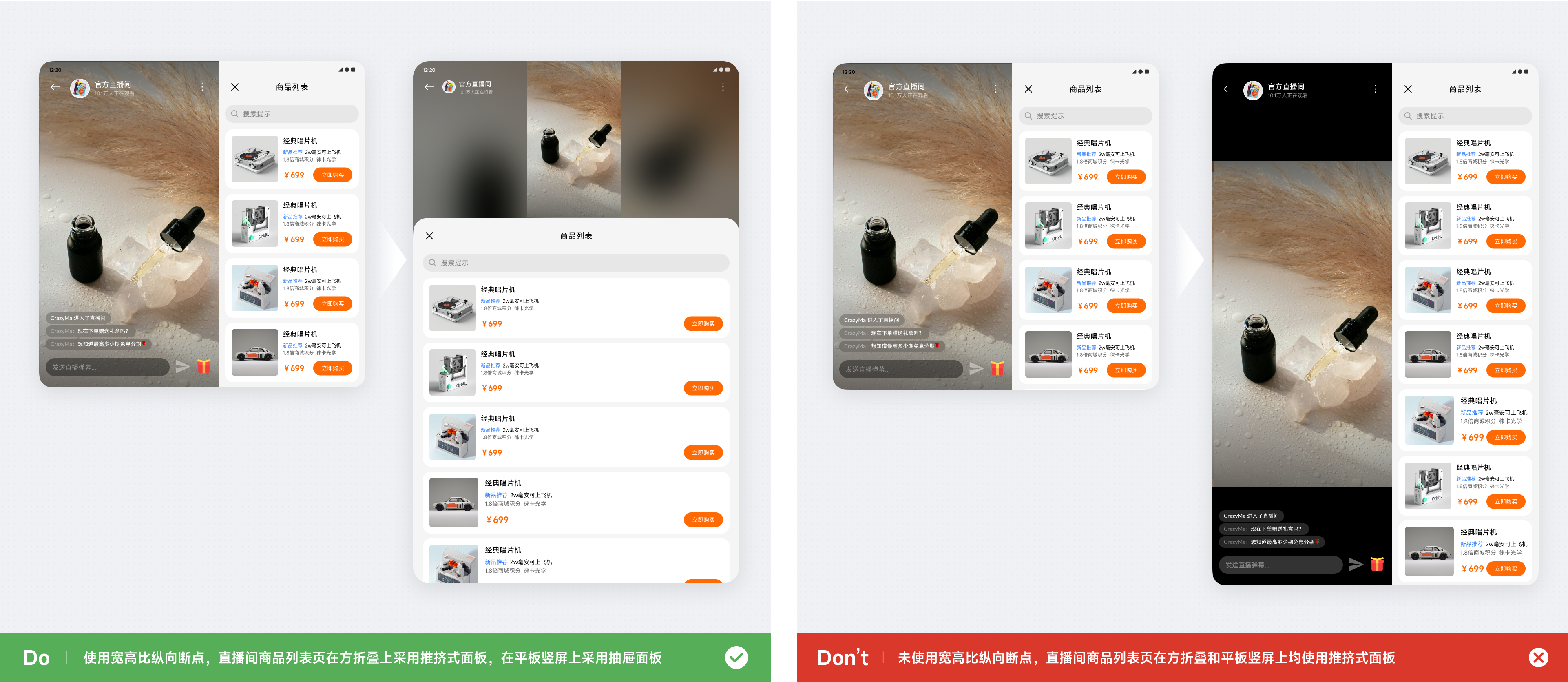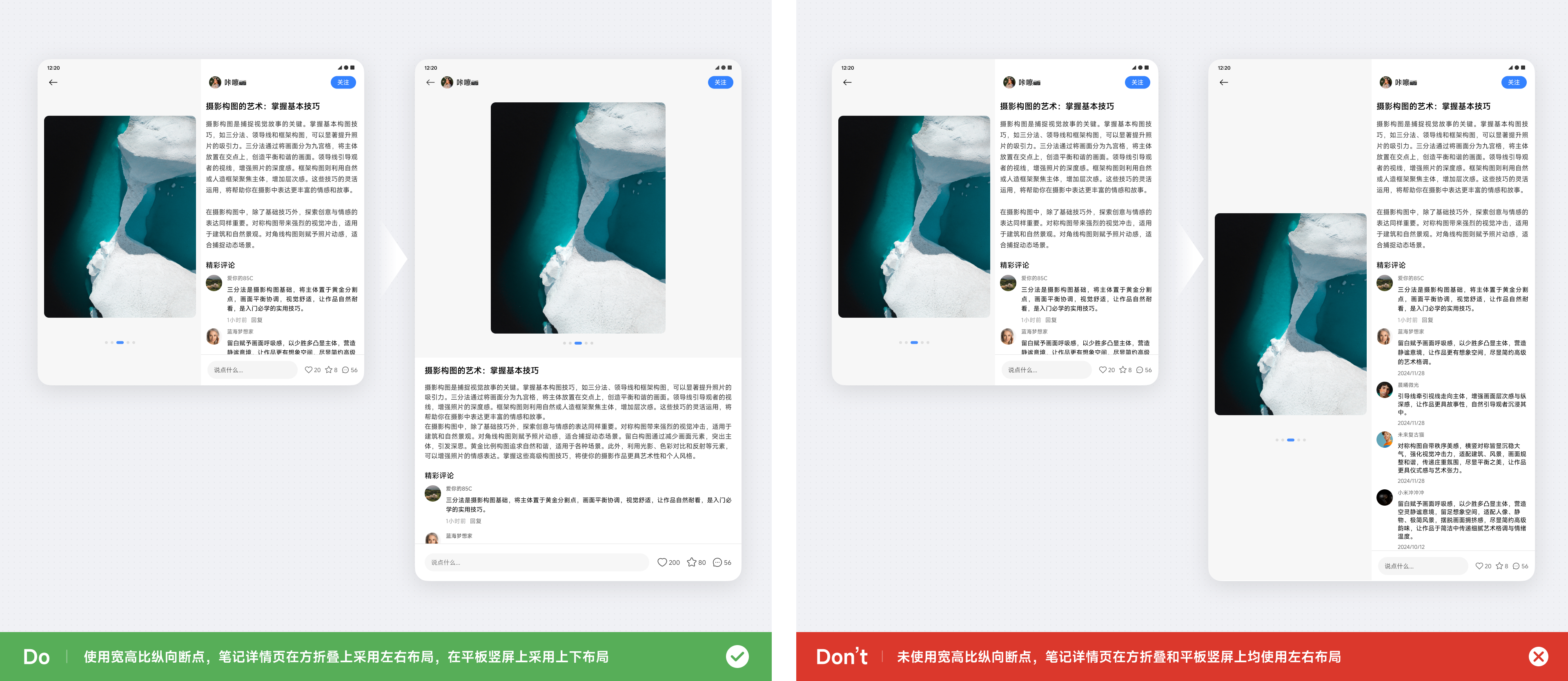 以方折叠和平板竖屏为例,随着设备高度增加,使用分栏、左右布局、推挤式面板会导致左右窗格比例不佳,因此推荐在特殊场景引入宽高比纵向断点,保障良好的显示效果。