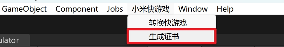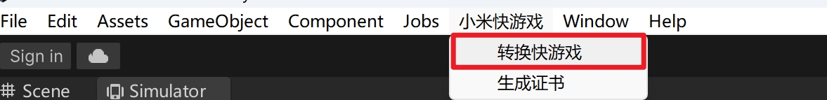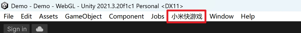 导入成功后Unity IDE工具栏会多出小米快游戏,如下图所示: