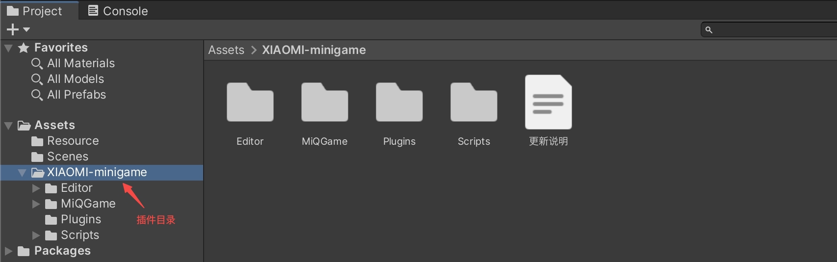 导入成功后,会自动在工程代码 Assets 目录下创建 XIAOMI-minigame 目录,如下图所示: