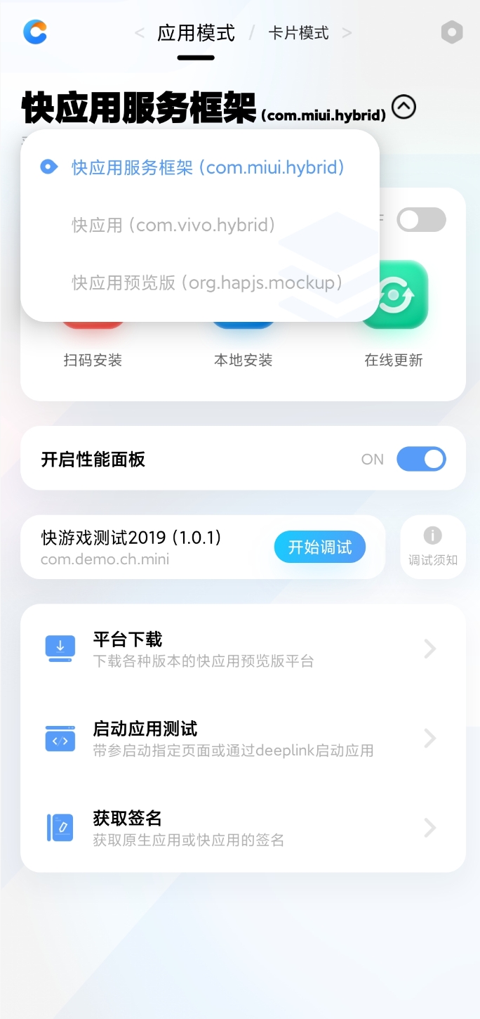 - 使用快应用调试器(下载地址:https://www.quickapp.cn/docCenter/post/69),本地安装即可启动游戏。