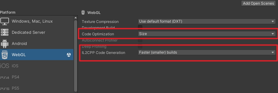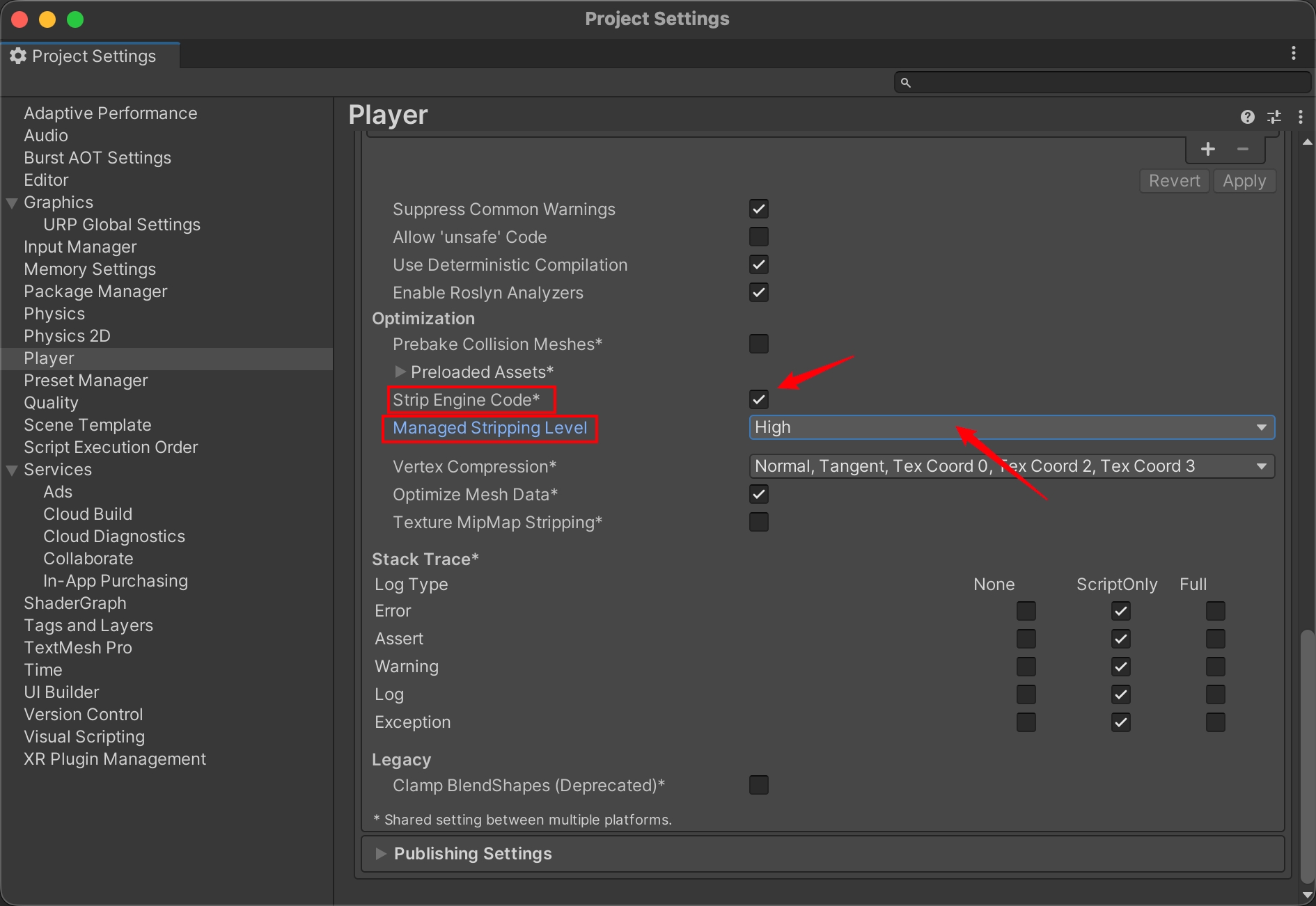 - 原始代码包(webgl/Build目录下的wasm文件)建议不超过30MB,建议开发者勾选"Strip Engine Code"并设置"Managed Stripping Level"为High。