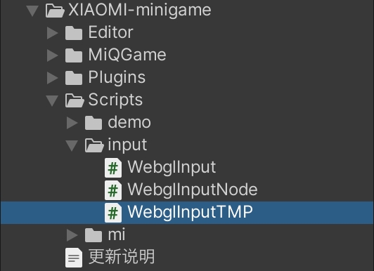 - 根目录/Scripts/:含一套C# SDK,方便C#环境调用小游戏的JS平台能力,详见本文档中「能力适配→小米sdk平台能力适配中的C# SDK部分的介绍」