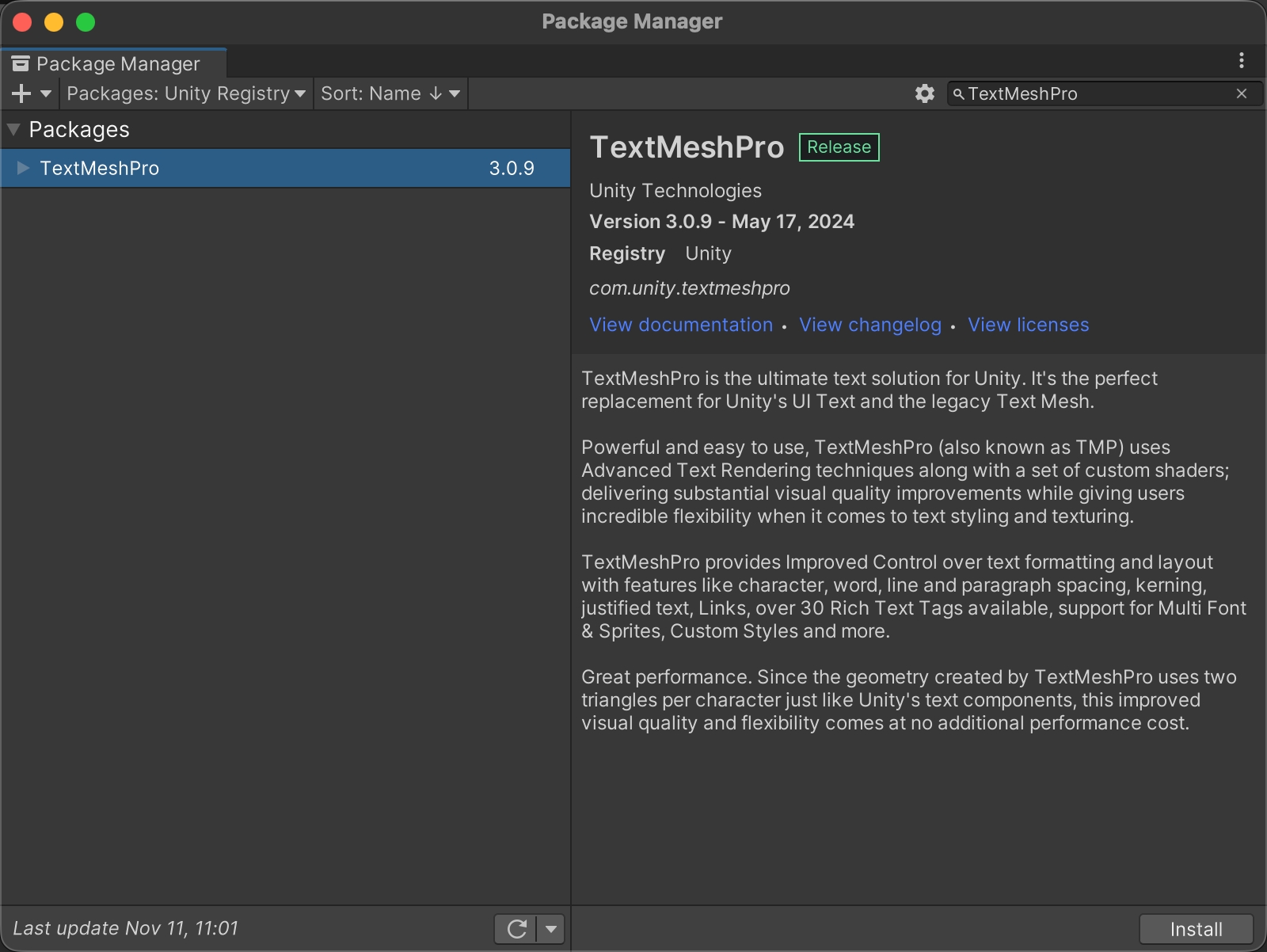 - 方法二:请在package manager里面搜索TextMeshPro安装即可。