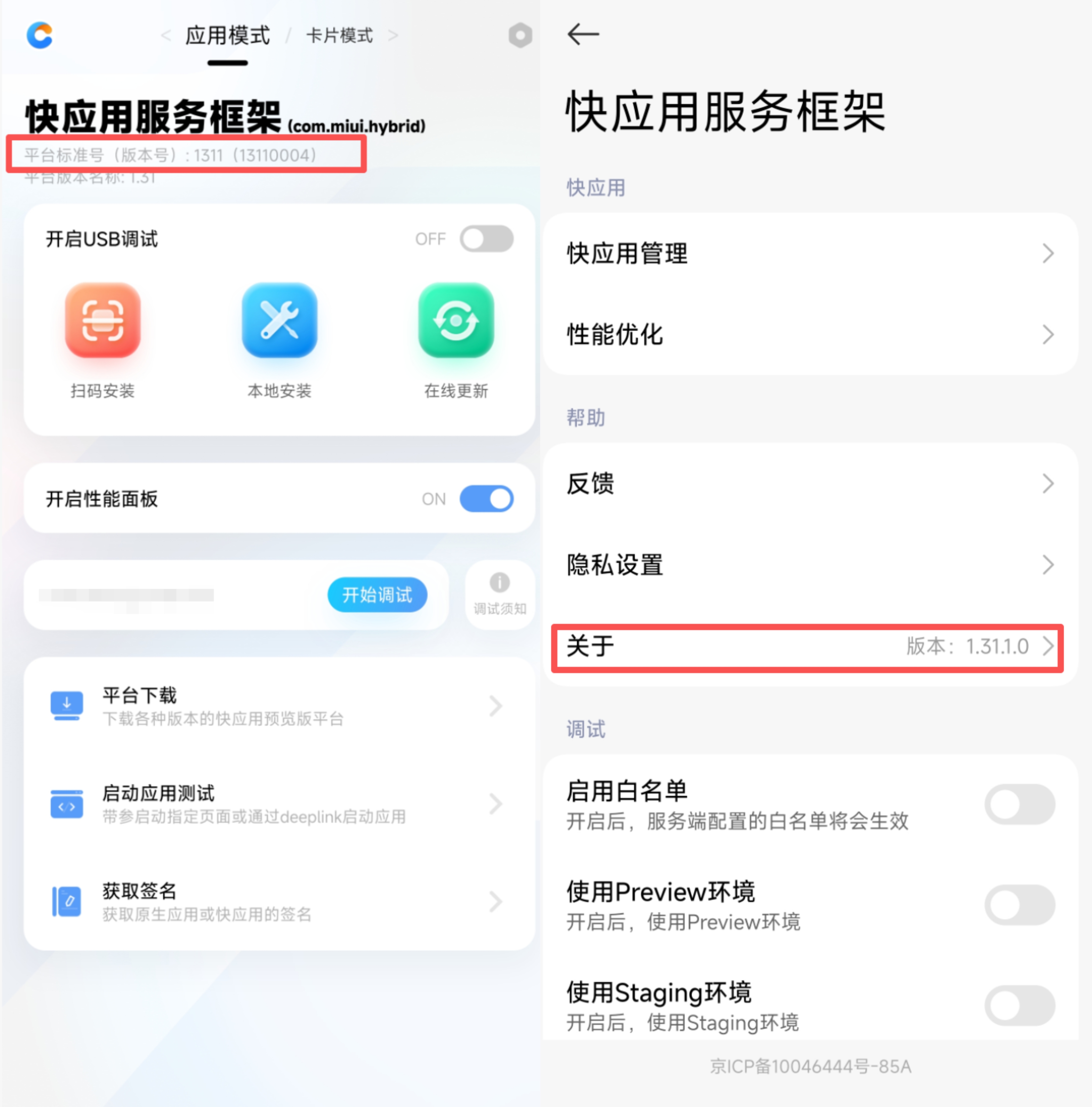 安装完成后可以在调试工具中看到快应用服务框架的版本号,也可以在设置中搜索“快应用服务框架”查看,如图: