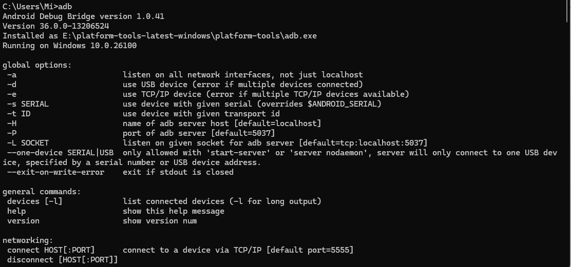 注:执行adb devices进行adb连接时,可能会出现卡住没反应的情况,此为正常情况,有可能是因为端口占用问题,可以执行taskkill /F /IM adb.exe将所有adb旧进程清理之后重试,经常连不上也可能是因为adb版本太老,需经常更新adb版本。