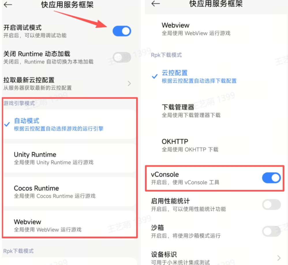 注意事项:1312版本以上的快应用框架需要在调试器设启动参数去切换运行环境和打开VConsole模式: