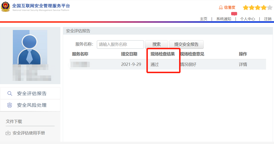 b.【APP在全国互联网安全管理服务平台的提交结果截图】,截图上“服务名称”或“名称”需与上传的应用名称一致、截图上主体名称需与开发者名称一致、截图中现场检查结果/备案状态必须为【通过】,结果为【待现场检查】、【整改】、【不通过】等情况均为无效上传)。