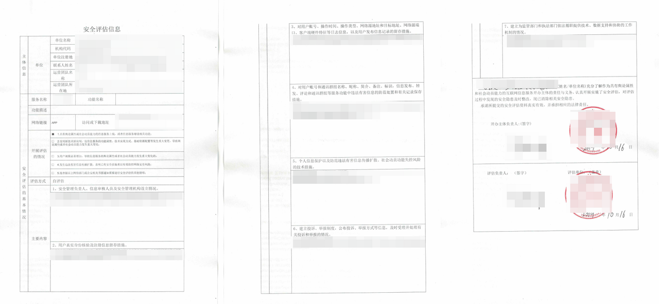| 社区/直播/交友/人工智能等 | 安全评估报告及全国互联网安全管理服务平台审批通过的截图 |