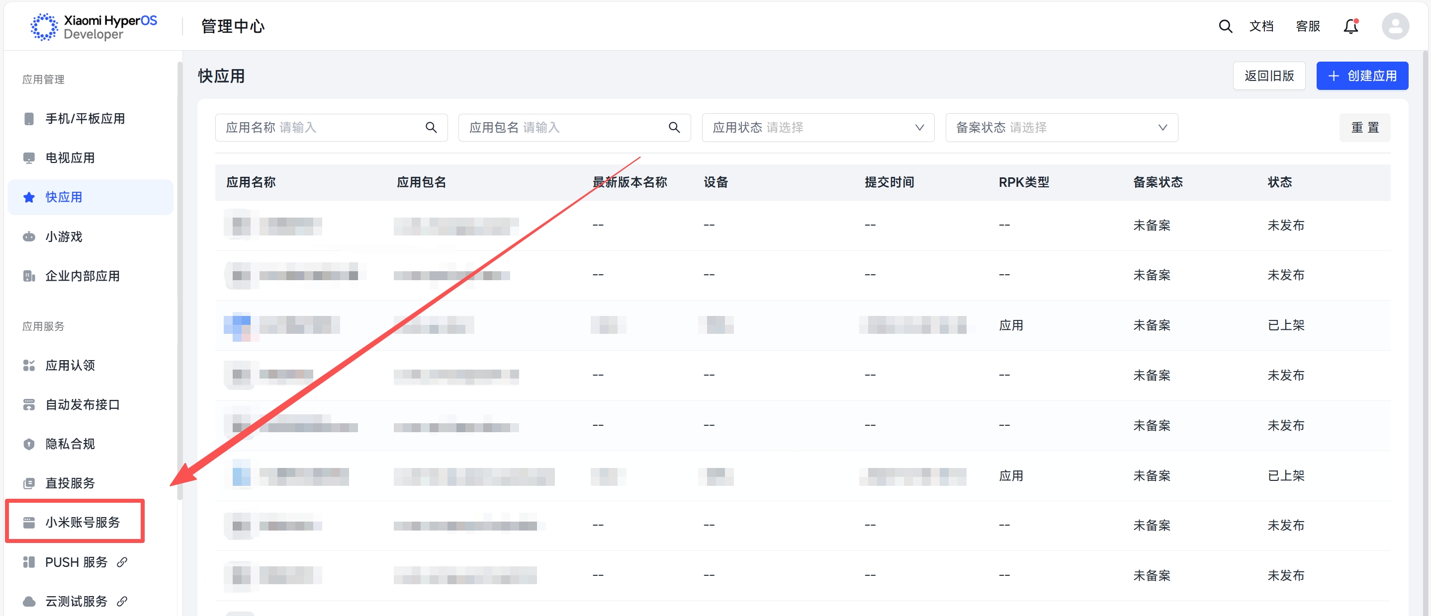 - 登录小米开放平台,左侧导航栏选 “开放服务”