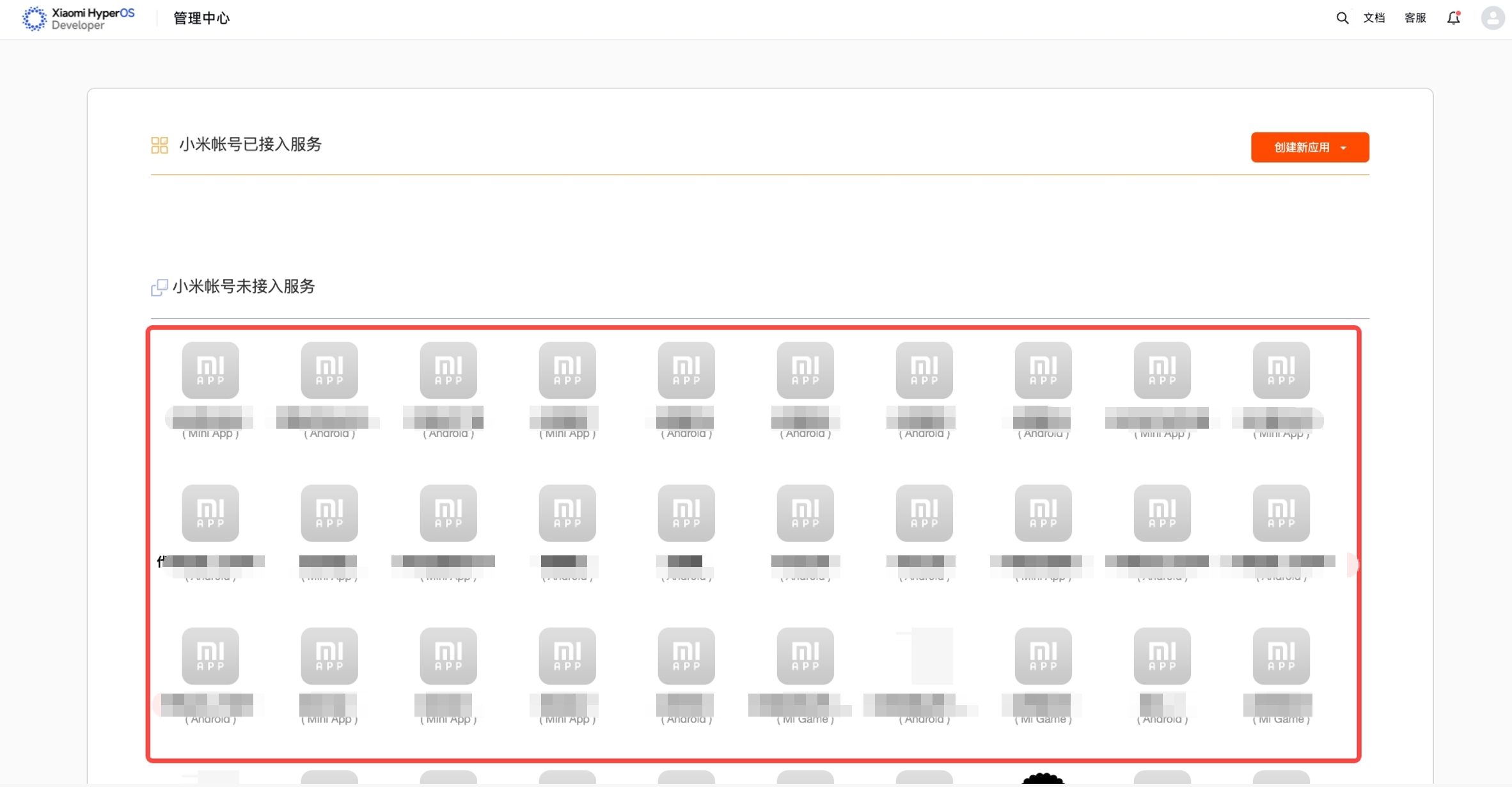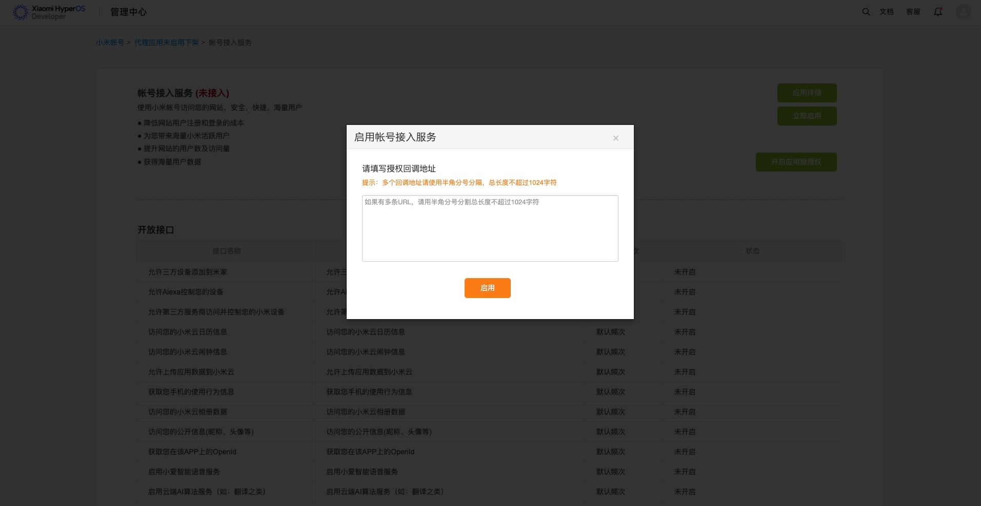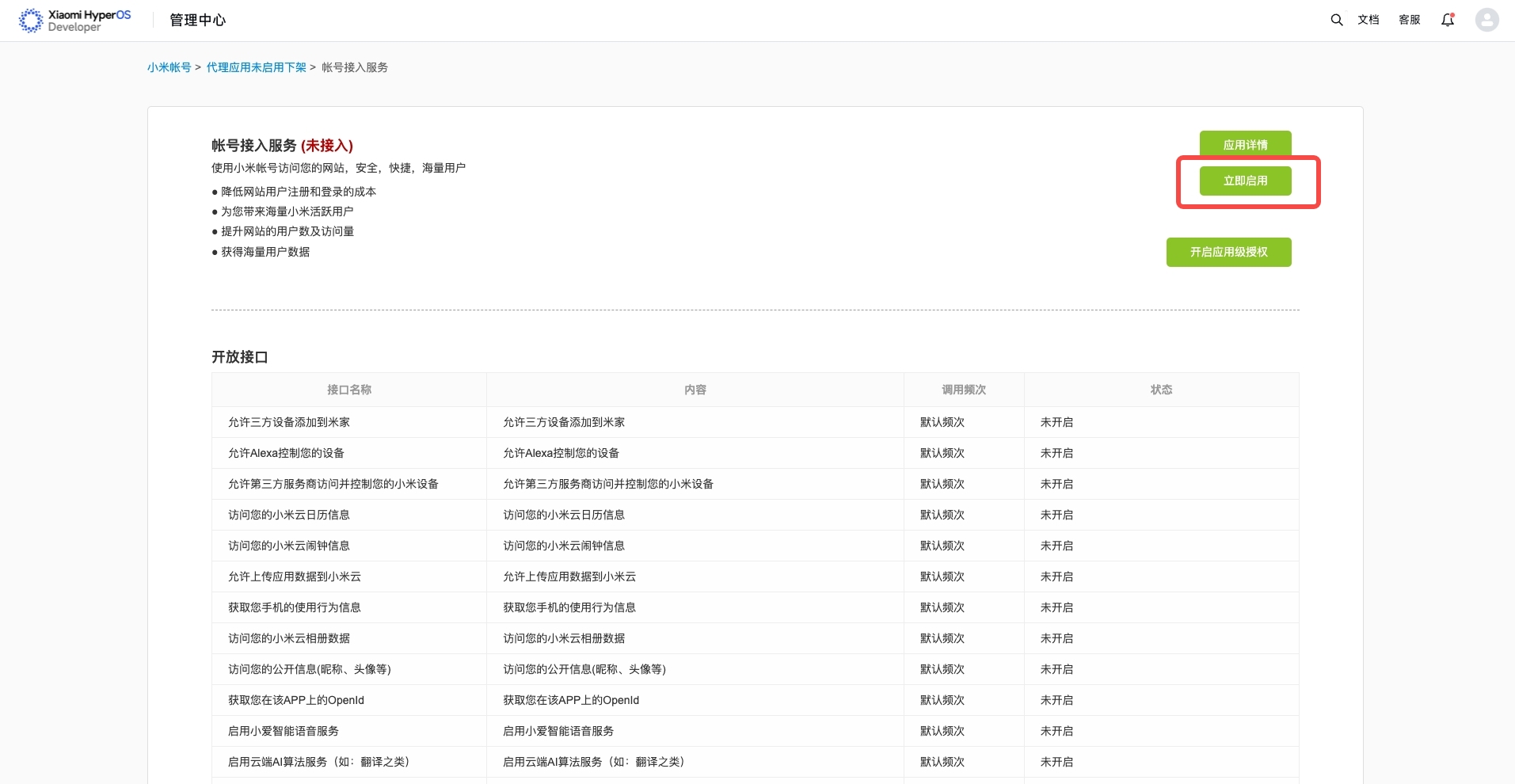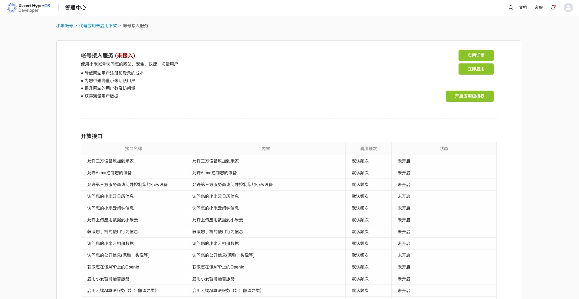 - 在小米账号未接入服务模块中找到已创建的快应用,点击需要开通服务的应用,进入账号接入服务页面
