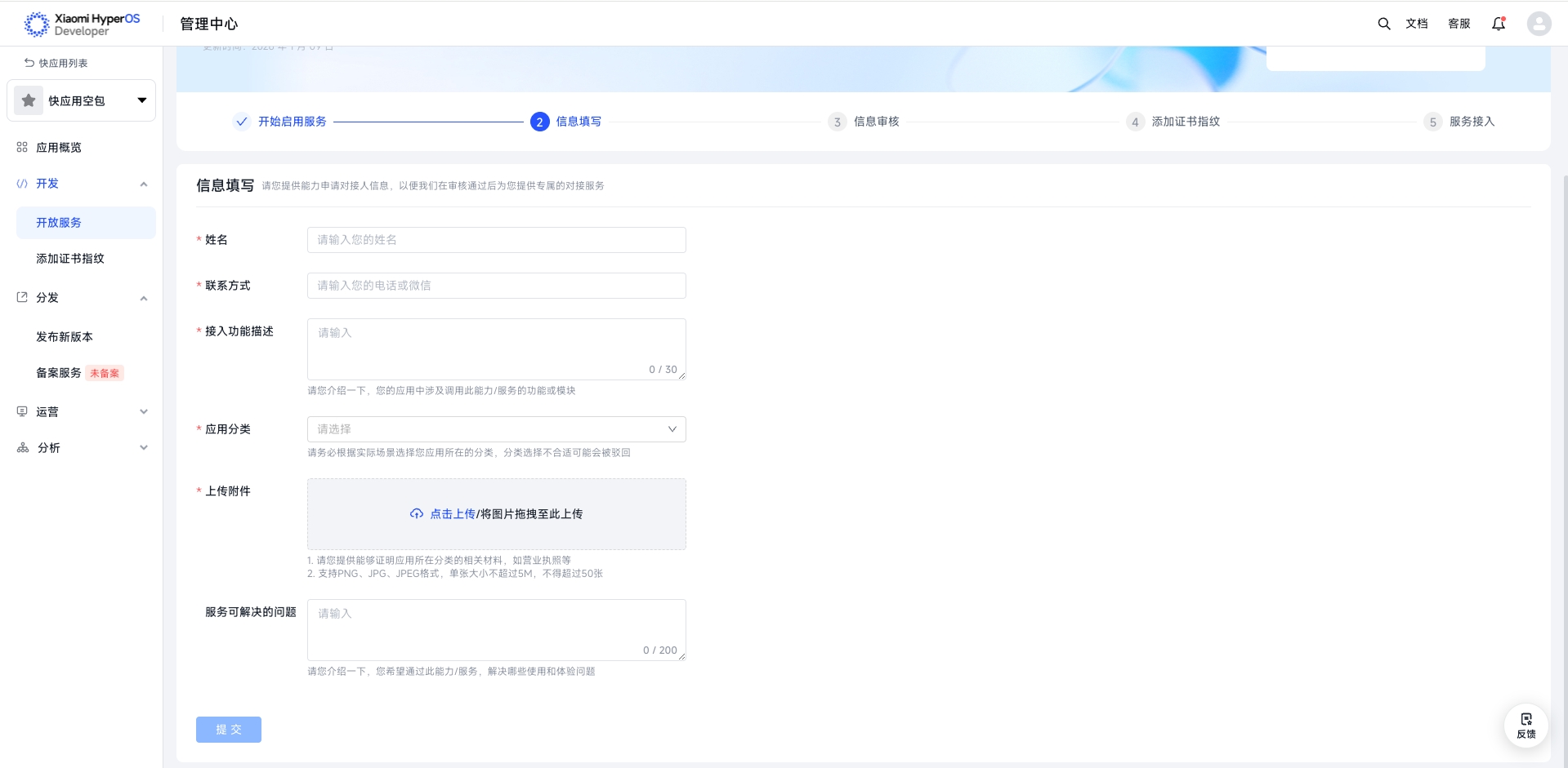 b.填写信息:依据页面信息填写要求完成信息填写,填写完成后,点击底部 “提交”按钮。
