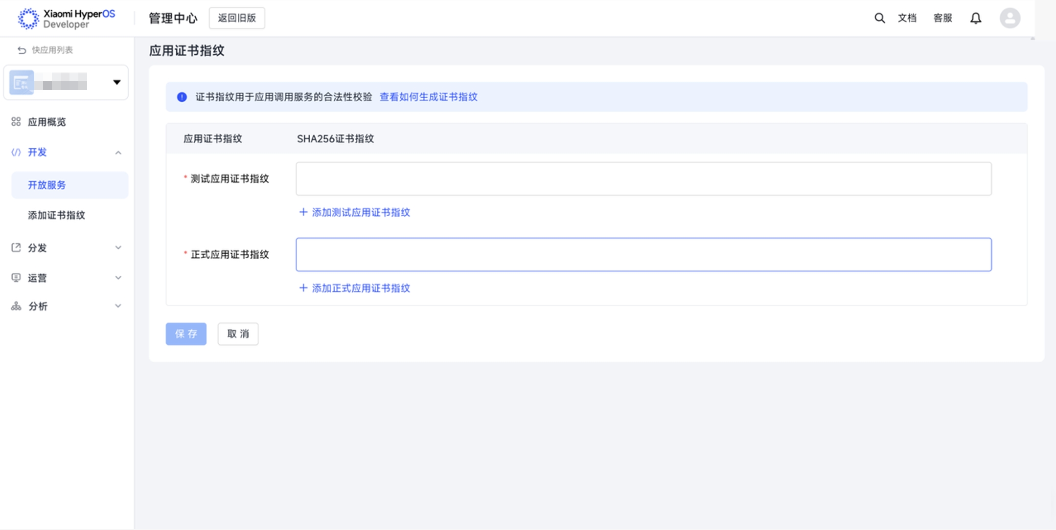 - 在“应用证书指纹”页,依据页面提示上传证书指纹,点击 #保存 按钮,即可提交