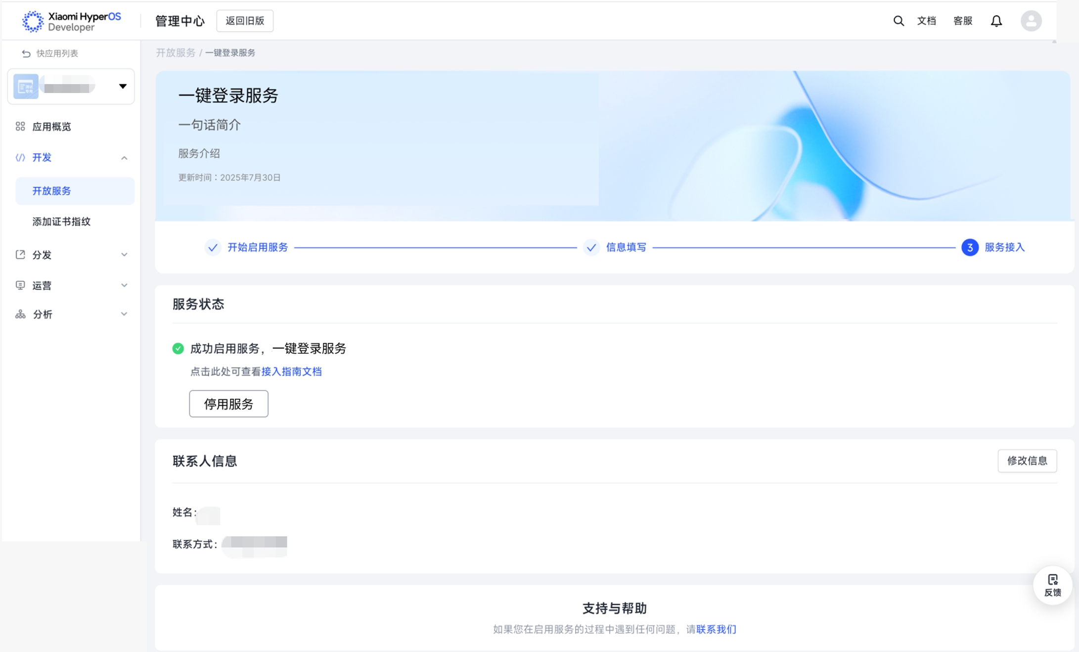 e.服务启用成功:添加指纹后自动进入“服务接入”页,显示 “服务状态:成功启用服务”,在此页面支持查看服务状态、停用服务,查看接入指南文档,查看及更改联系人信息